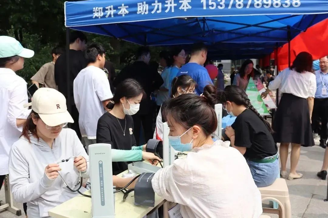 在义诊区,10家医院20余名优秀的营养科专家教授参加义诊活动,利用便携测定设备为现场老师同学们设定人体体脂、肌肉、蛋白等营养成分,并进行BMI值推算、血压测定。虽然天气炎热,但大家还是排起长龙,等候入场。医护人员为老师同学免费测量人体成分300余次,免费测量血压300余次,接受咨询50余次,受到广泛好评。