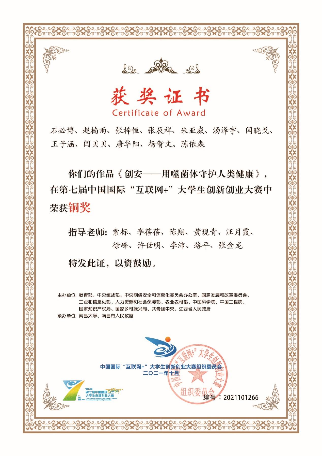 2021年,第七届中国国际“互联网+”大学生创新创业大赛总决赛,高教主赛道铜奖,第一指导老师,中国教育部。