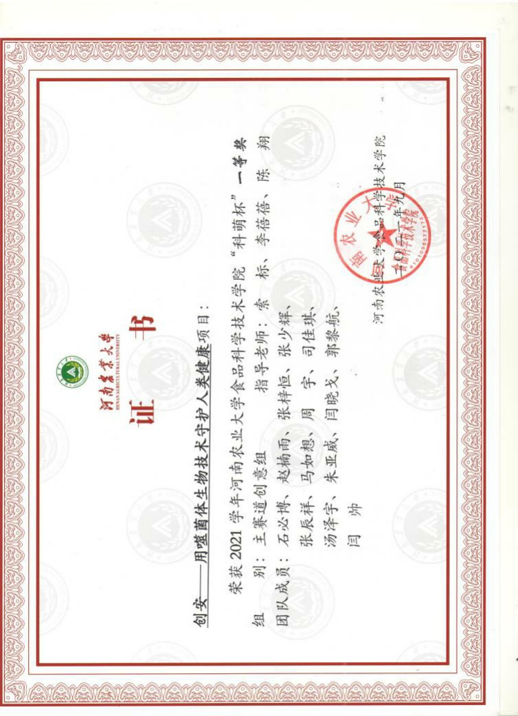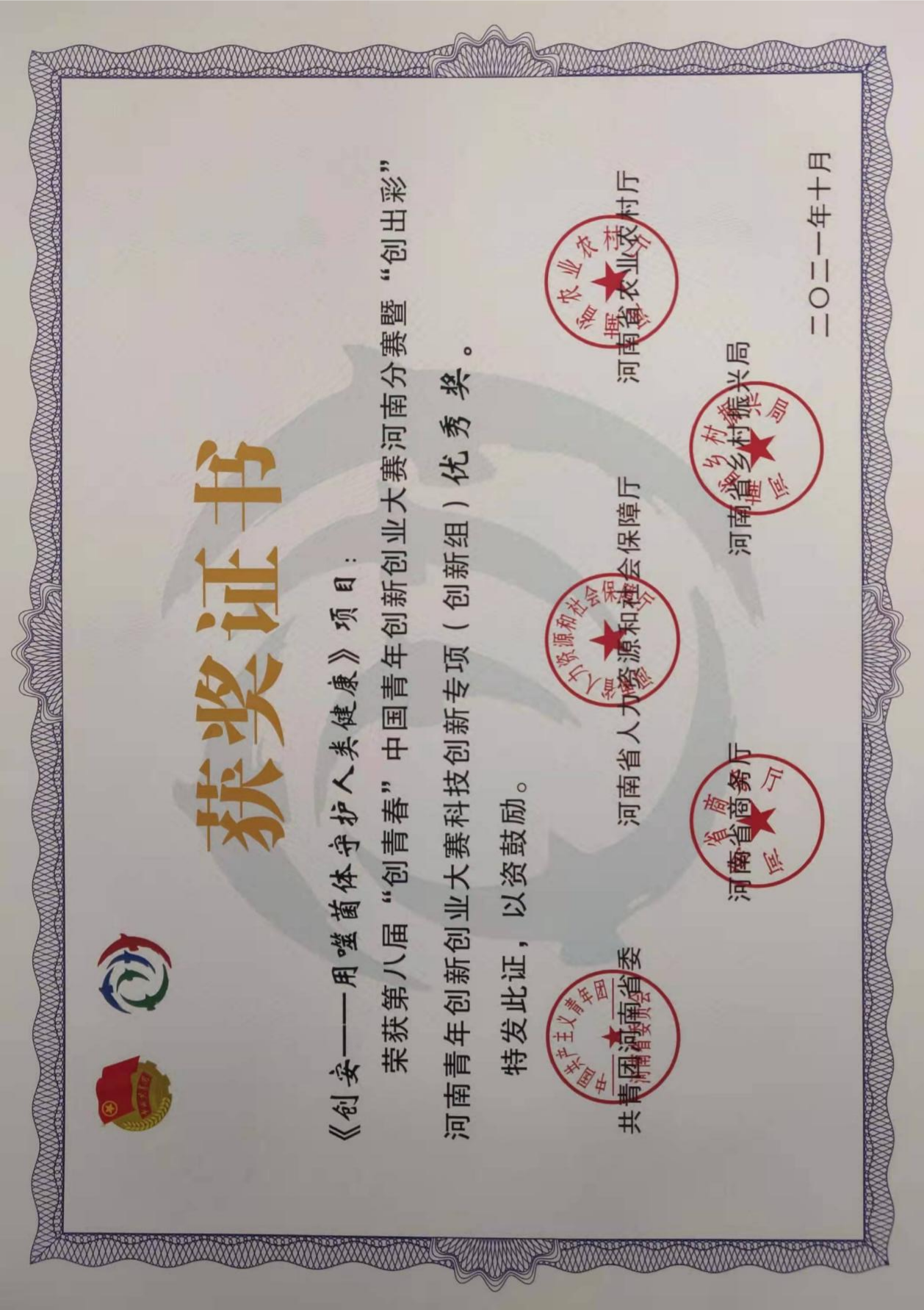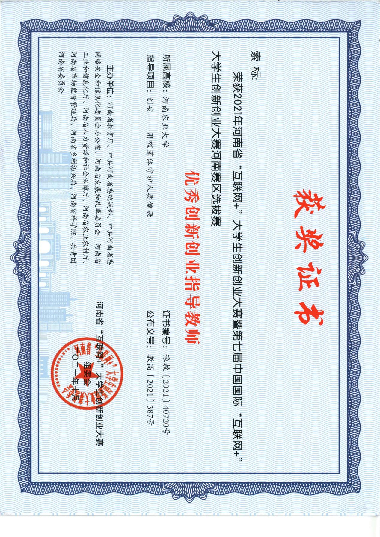 2021年,第八届“创青春”中国青年创新创业大赛河南分赛暨“创出彩”河南青年创新创业大赛科技创新专项(创新组),优秀奖,第一指导老师,共青团河南省委,河南省人力资源和社会保障厅,河南省农业农村厅,河南省商务厅,河南省乡村振兴局。