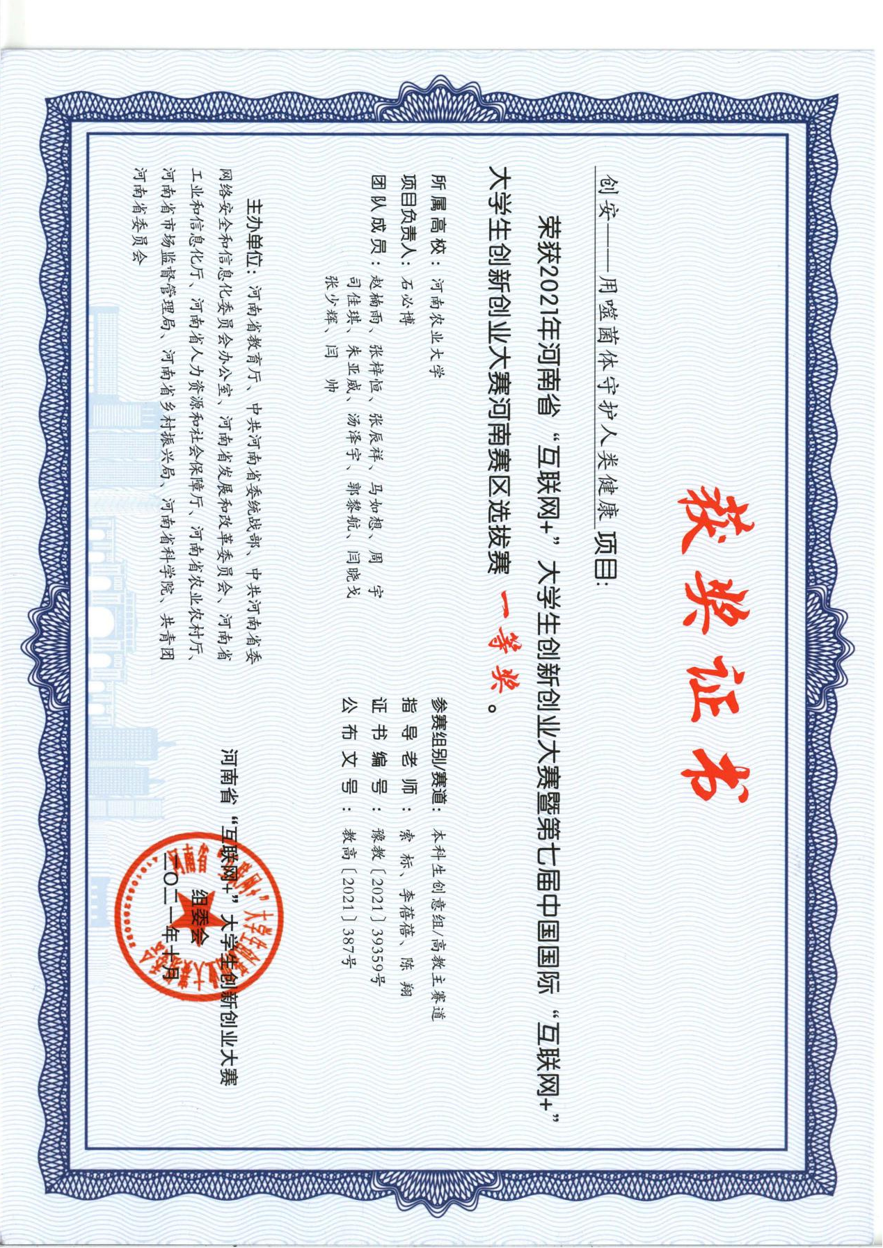 2021年,河南省“互联网+”大学生创新创业大赛暨第七届中国国际“互联网+”大学生创新创业大赛河南赛区选拔赛,一等奖,第一指导老师,获“优秀创新创业指导老师奖”,河南省教育厅。