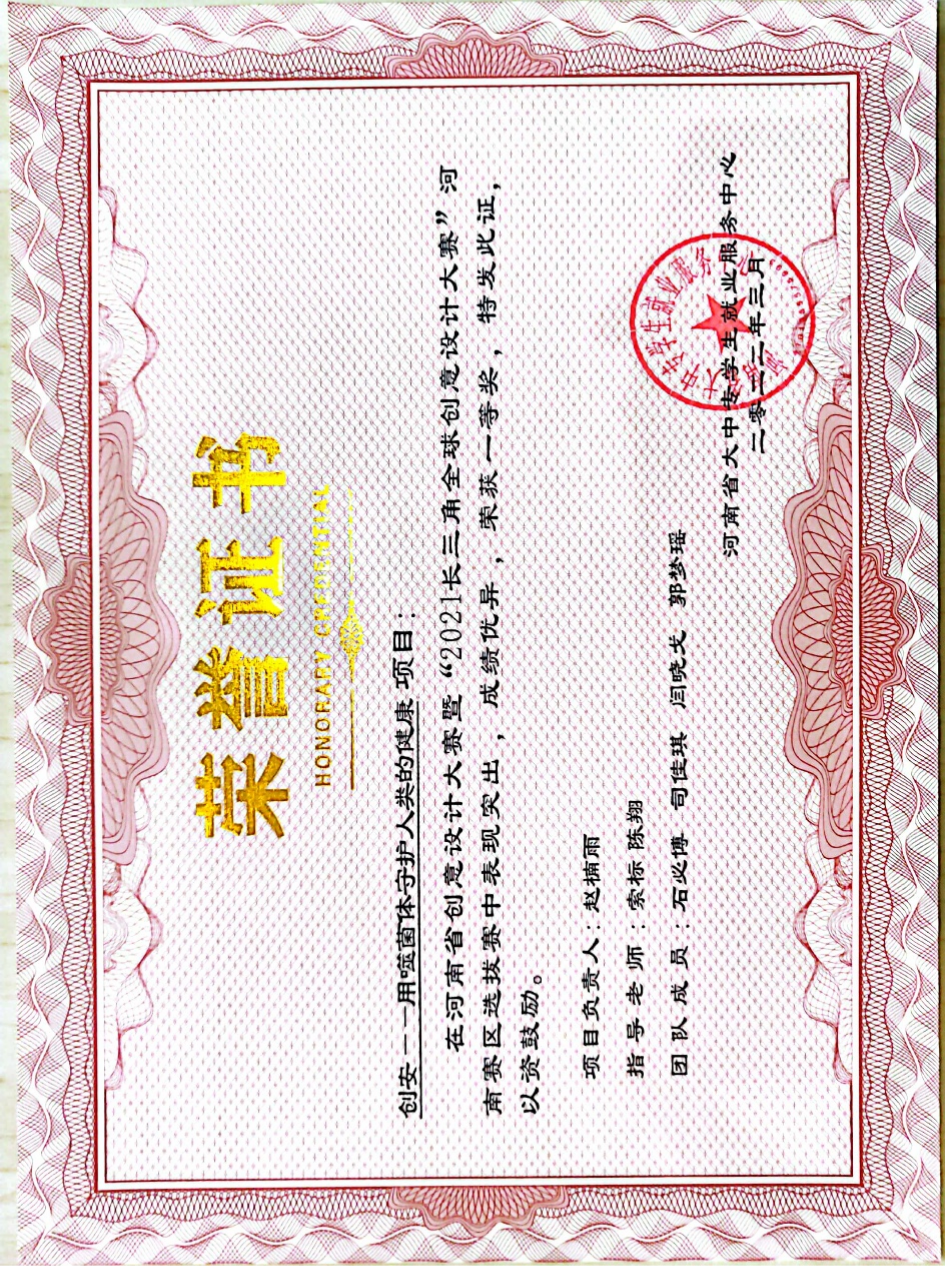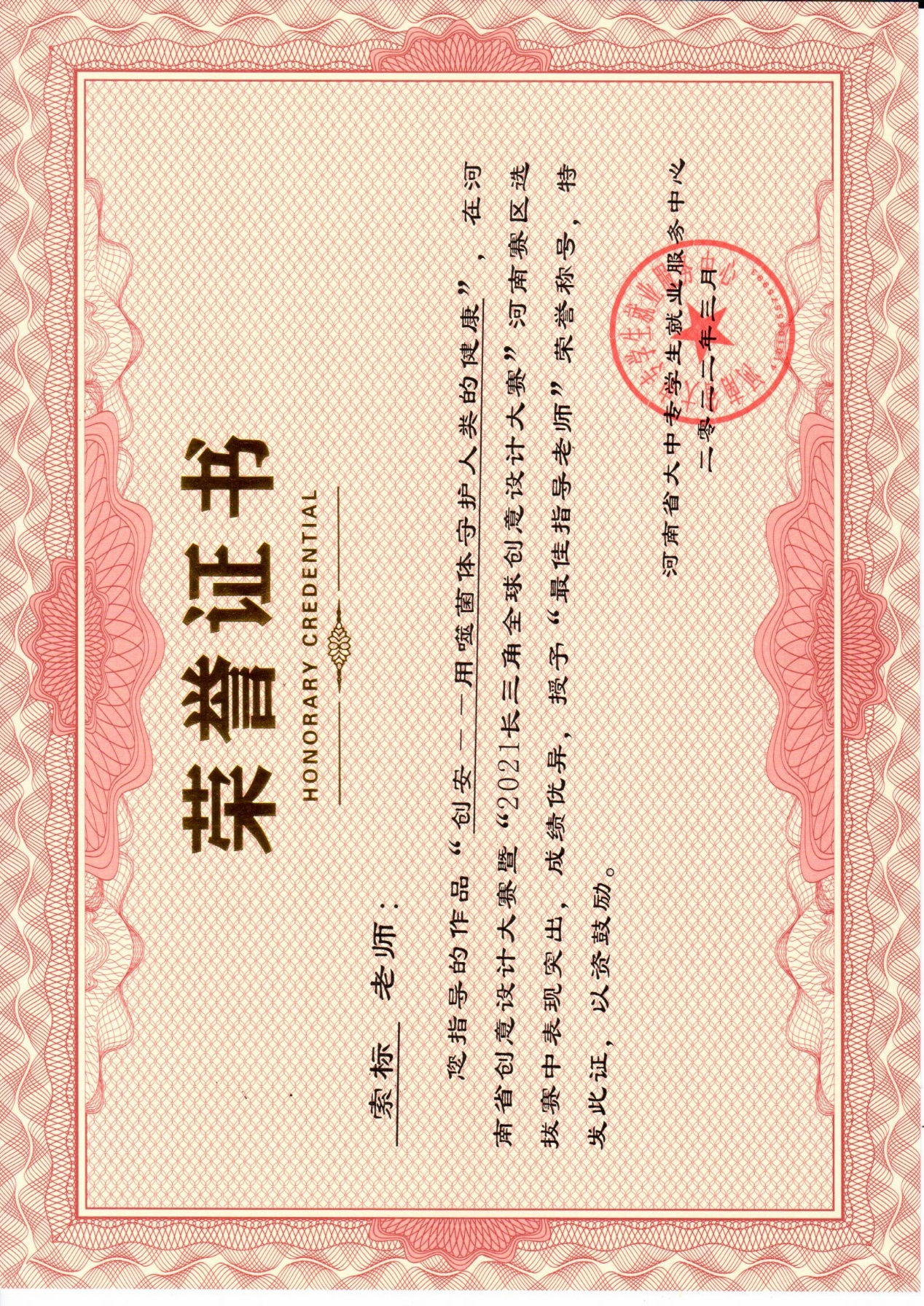 2022年,河南省创意设计大赛暨“2021长三角全球创意设计大赛”河南赛区选拔赛,一等奖,第一指导老师,荣获“最佳指导老师”,河南省大中专学生就业服务中心。
