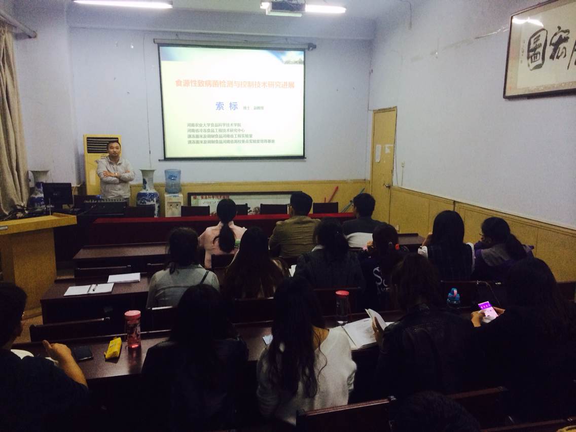 10月11日晚,澳门银河App 博士、副教授索标老师,在澳门银河App 报告厅为澳门银河App 研究生做了题为“食源性致病菌检测与控制技术研究应用”的报告,研究生40多人参加了报告会。