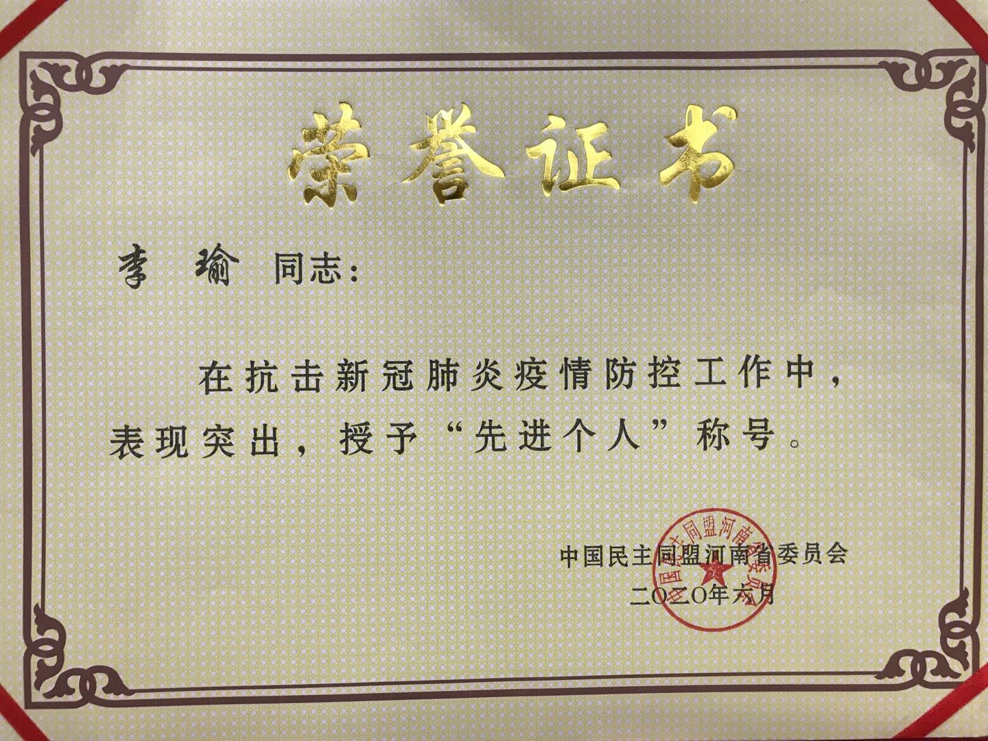 鉴于在疫情期间的突出表现,澳门银河App 教师李瑜同志被民盟河南省委授予“抗疫先进个人”荣誉称号。