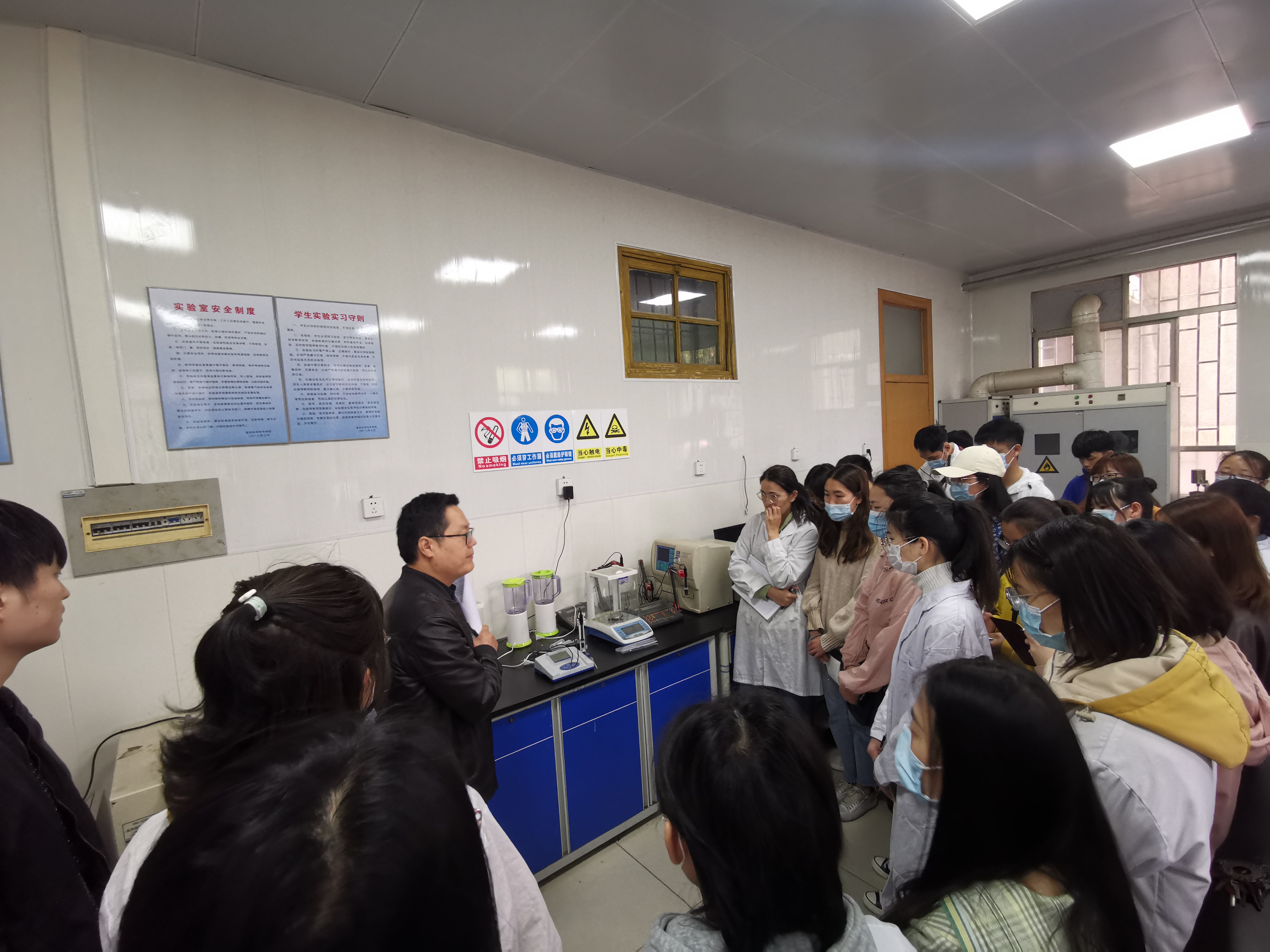中心实验室主任乔明武老师首先强调了实验室安全,并就实验过程中经常出现的技术问题进行了解答。随后针对毕业实习中常用的小件实验设备,酸度计、分光光度计、离心机、脂肪仪、消化炉、定氮仪等,就仪器的工作原理、规范操作、维护保养等作了讲解,并结合近年来校内外发生的实验室安全事故,着重强调了各类实验仪器操作的要点,提醒同学们提高安全意识。最后,针对实验危化品使用及实验废弃物的处理,简要介绍了安全贮存与回收等管理办法。