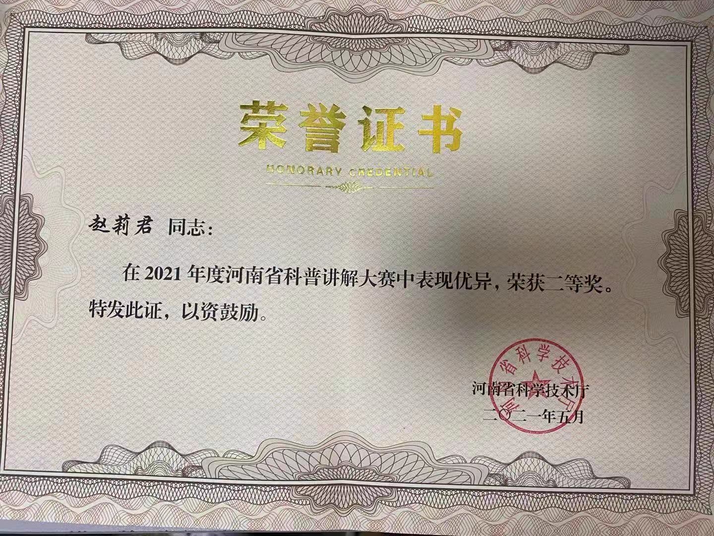 赵莉君老师荣获河南省科普讲解大赛二等奖、河南省科普讲解大赛最佳口才奖,这是澳门银河App