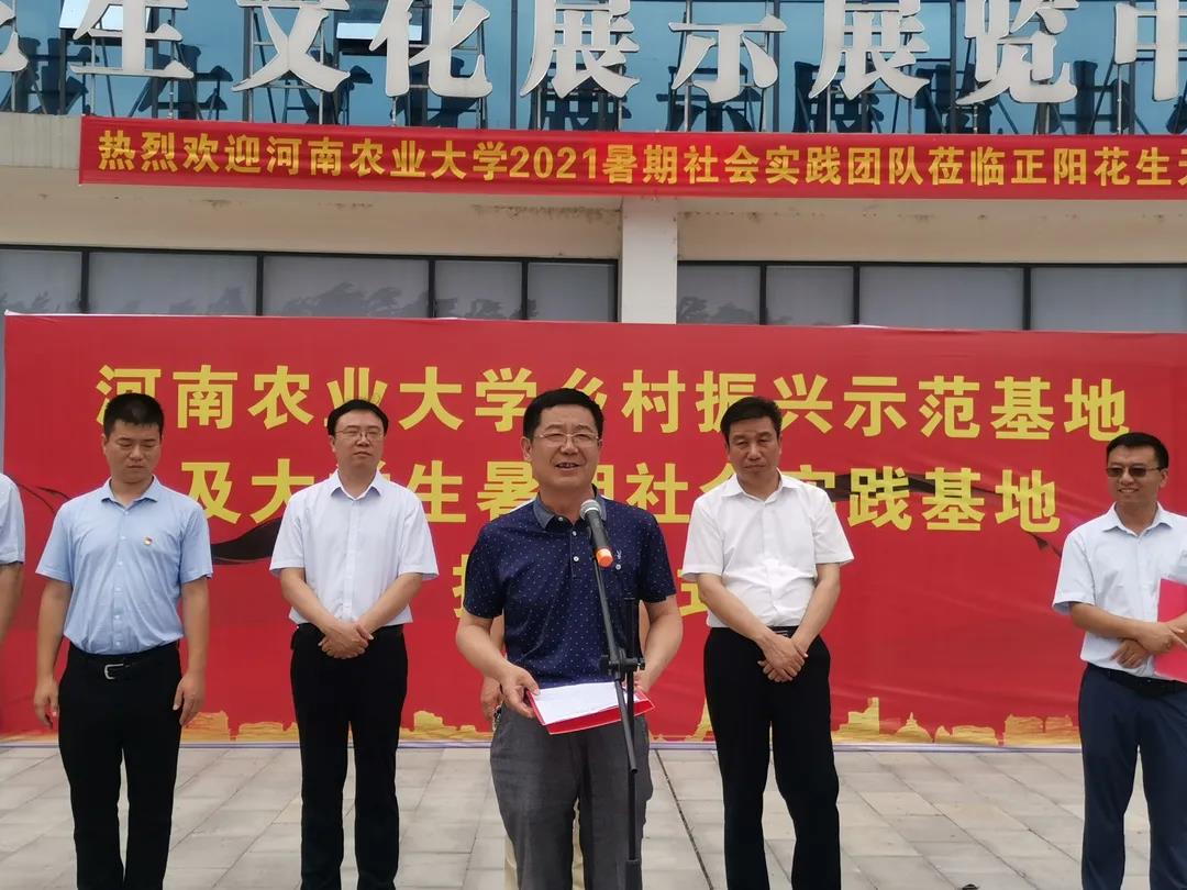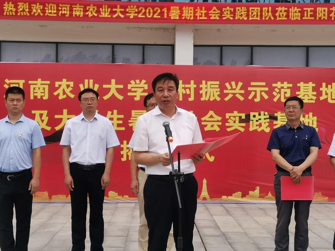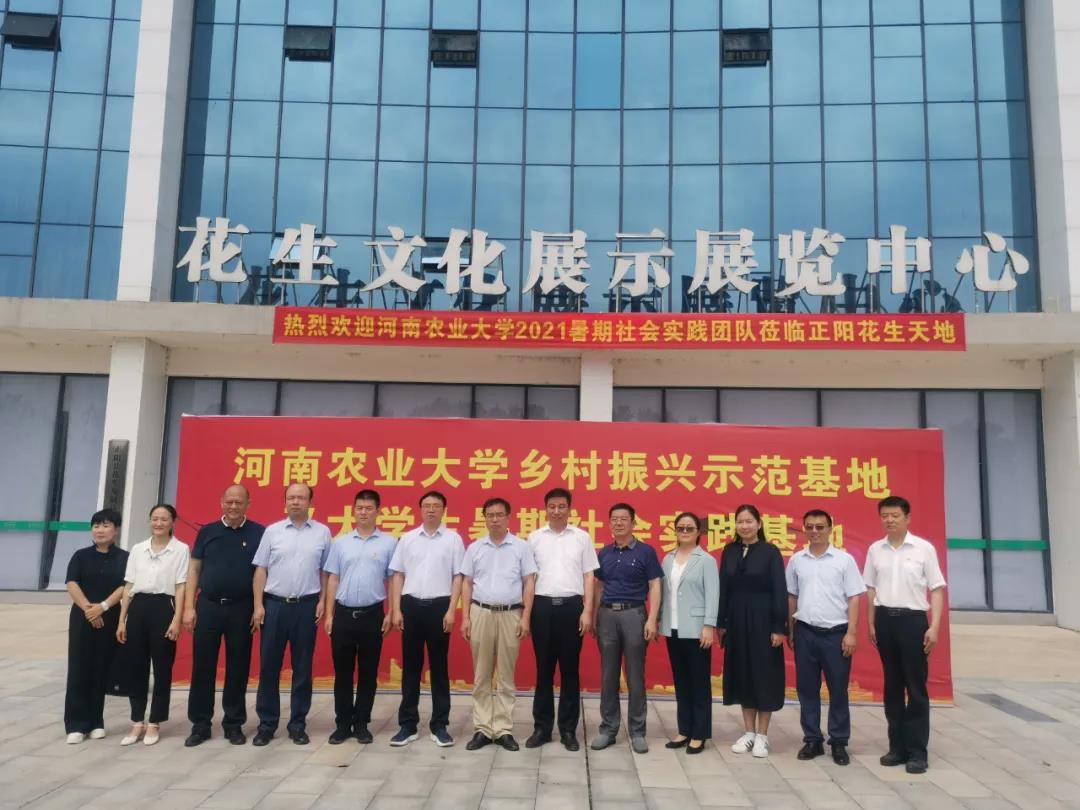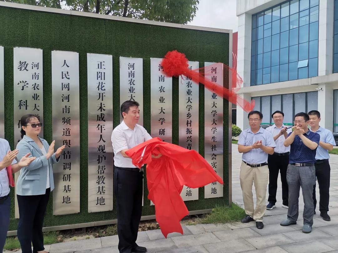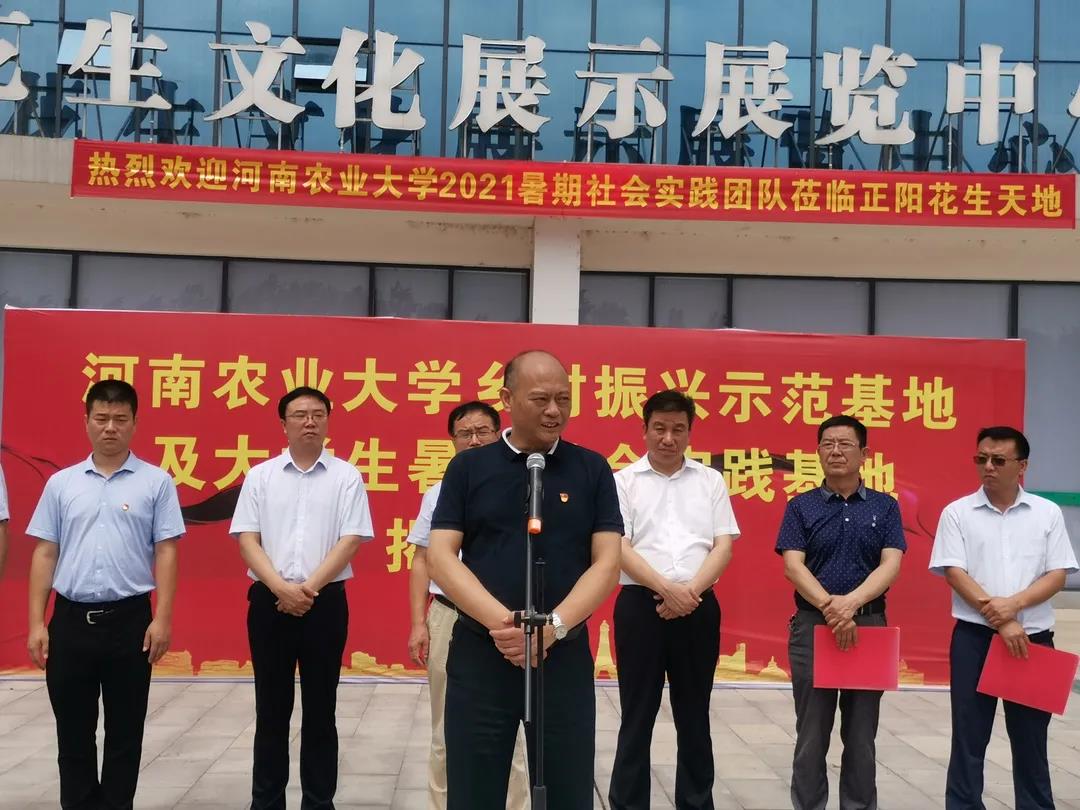 乡村振兴志愿者服务站等四个基地的揭牌仪式于正阳县新地花生集团举行。正阳县委常委、常务副县长蒋贵印、副县长马红珍、县检察院检察长侯亚军,新地花生集团董事长李广海,校党委研工部部长张红阳、社会服务处副处长赵建中、校团委副书记曹永甲,澳门银河App