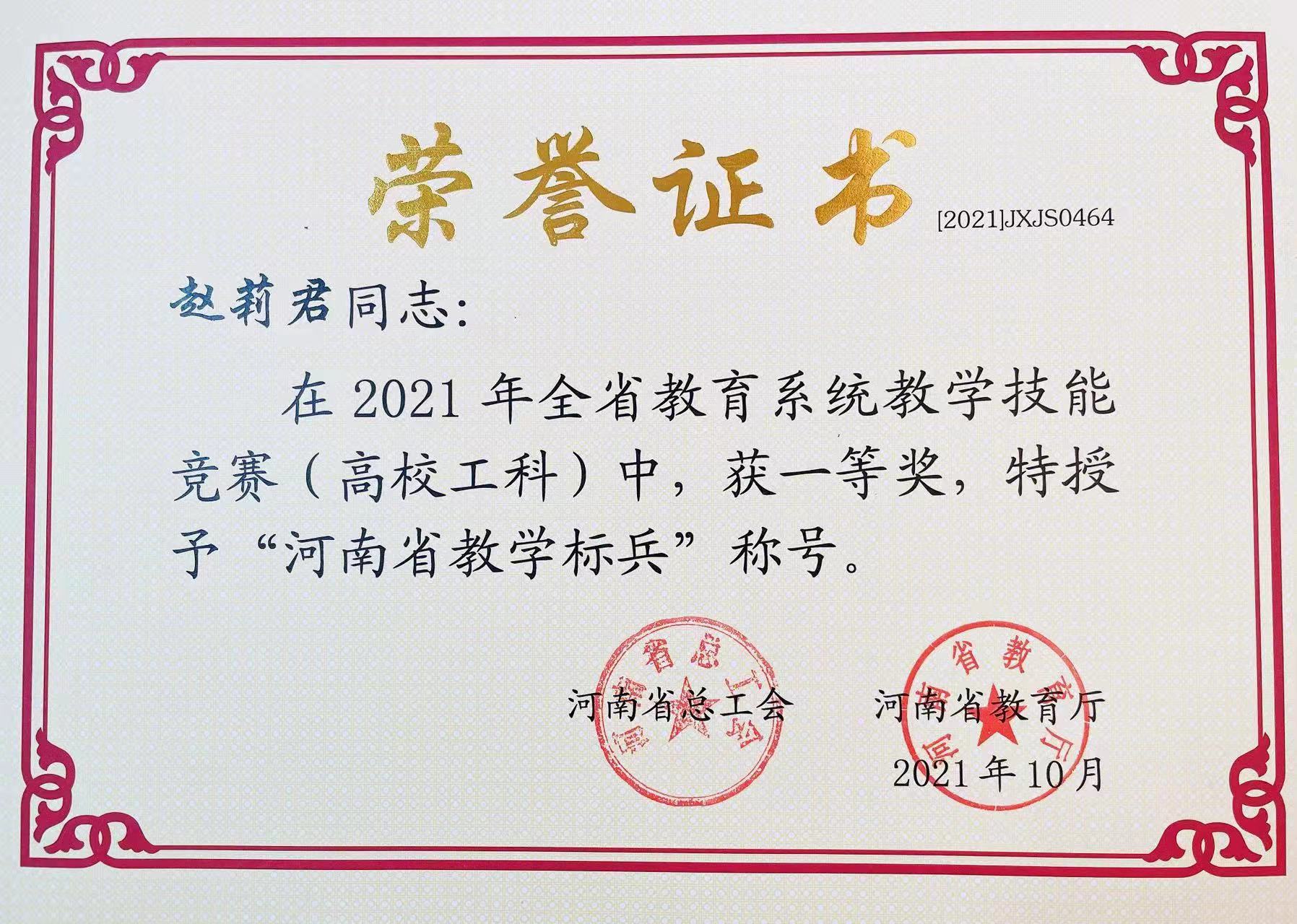赵莉君老师最终获2021年全省教学系统技能竞赛(高校工科)一等奖,并被授予“河南省教学标兵”荣誉称号。