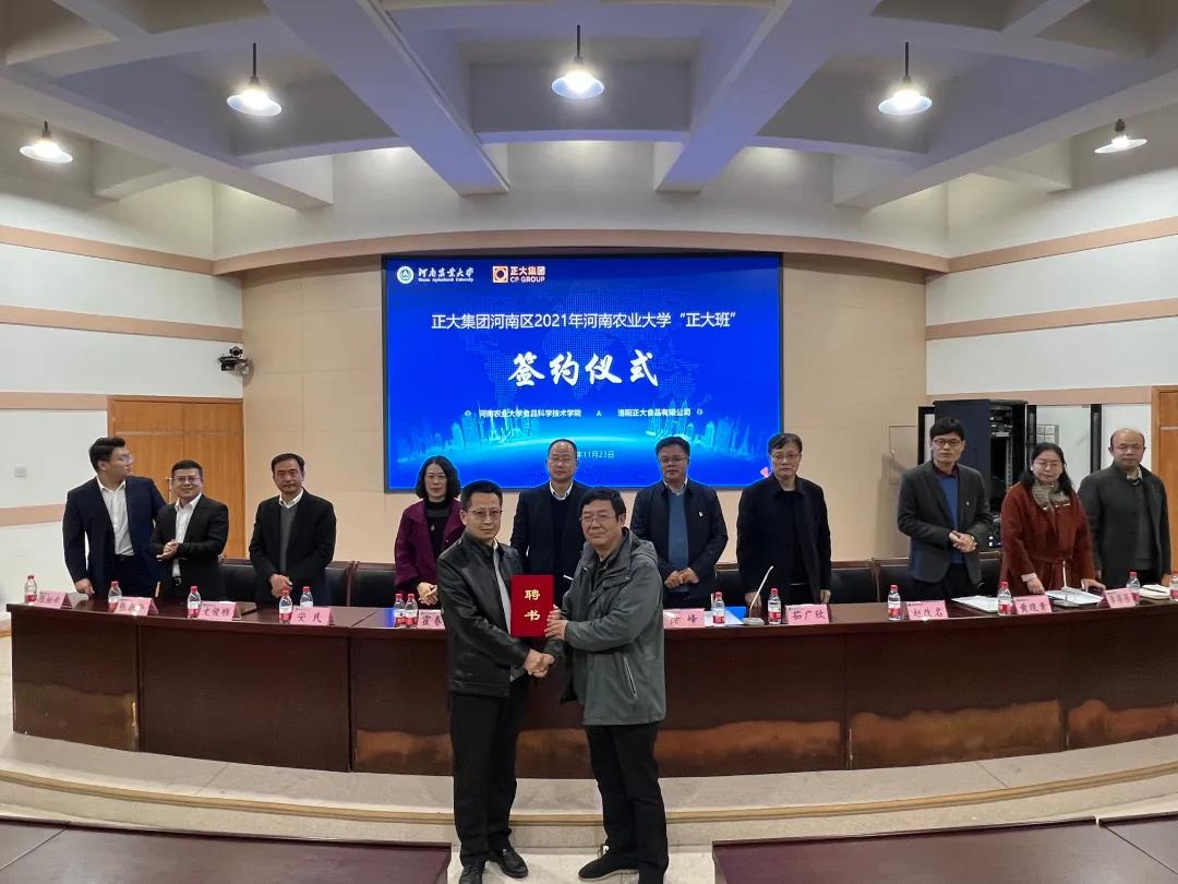 “正大班”签约仪式,洛阳正大食品有限公司副总裁沈道华、正大集团河南区人力资源总监霍春阳、洛阳正大食品有限公司市场总监安民、正大集团河南区饲料养殖事业人事主管文俊雅、洛阳正大食品有限公司人力主管张振华、正大集团河南区招聘总监陈柏希、校党委学工部部长徐峰、校教务处副处长茹广欣、澳门银河App