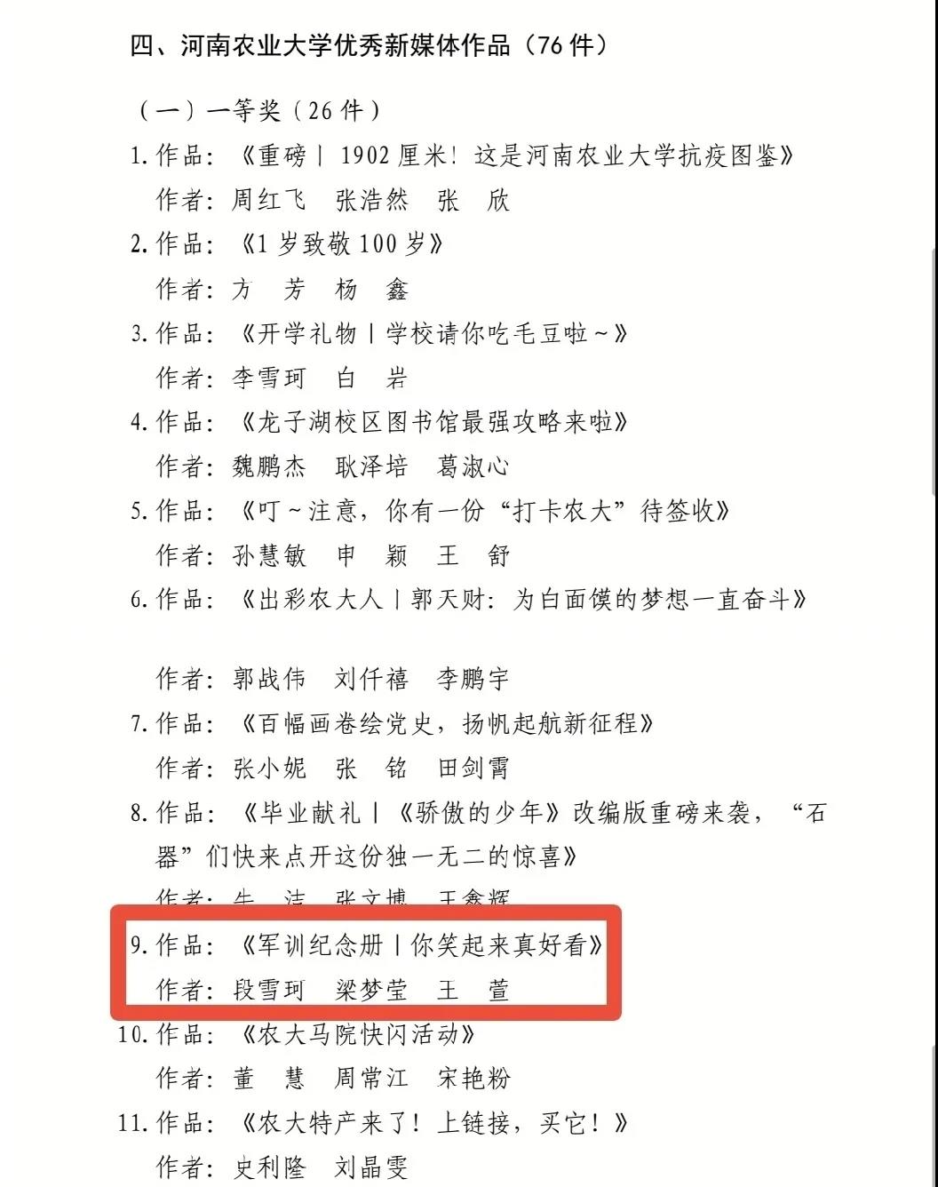 十佳新媒体平台、十佳短视频、优秀新媒体工作者、优秀新媒体作品的决定文件》(校党宣〔2021〕12 号)。院团委副书记陈翔、院新媒体主任梁梦莹荣获“优秀新媒体工作者”的荣誉称号,段雪珂等人作品《军训纪念册|你笑起来真好看》荣获一等奖,祁红丽等人作品《战“疫”必胜 | 澳门银河App