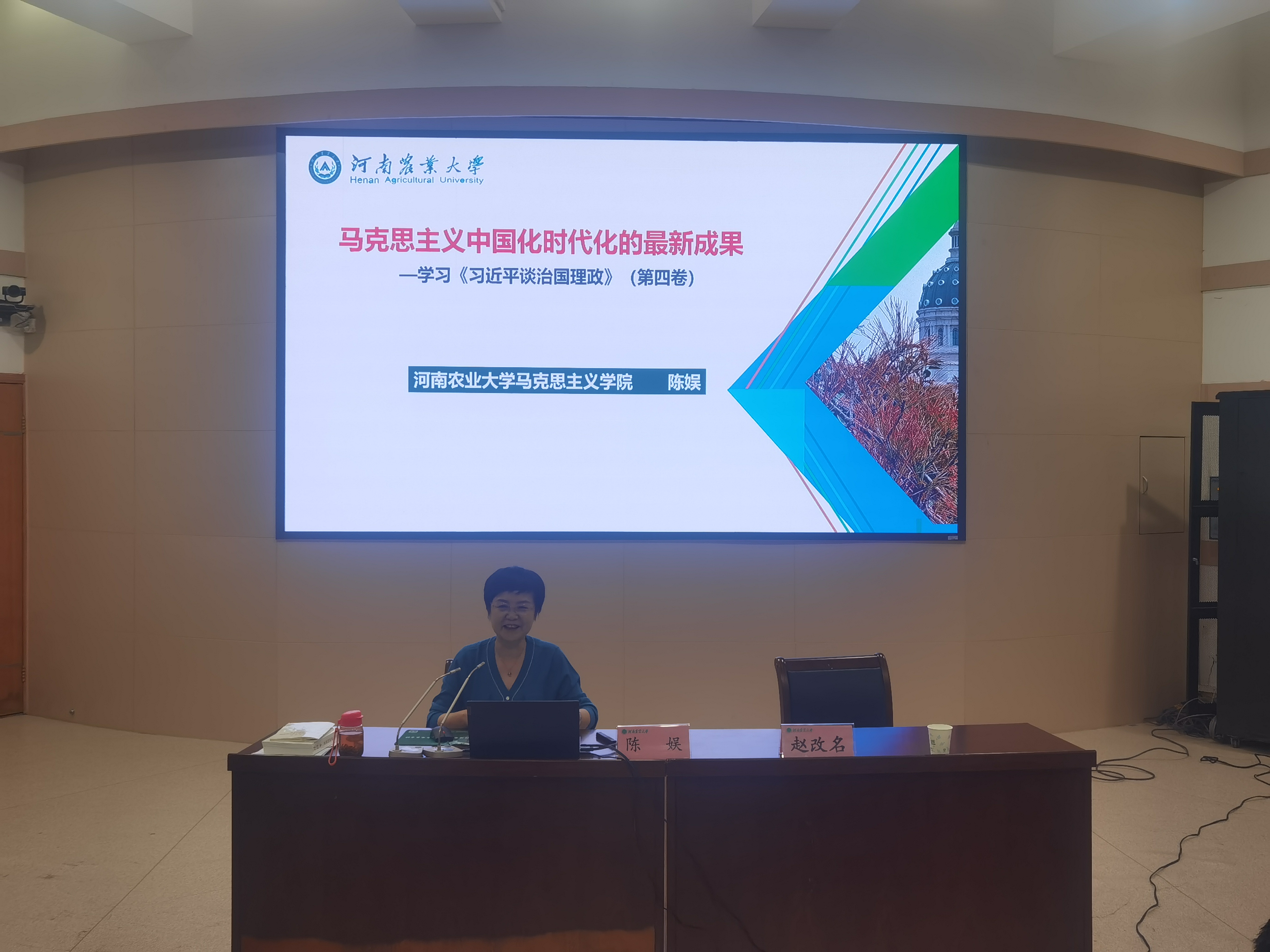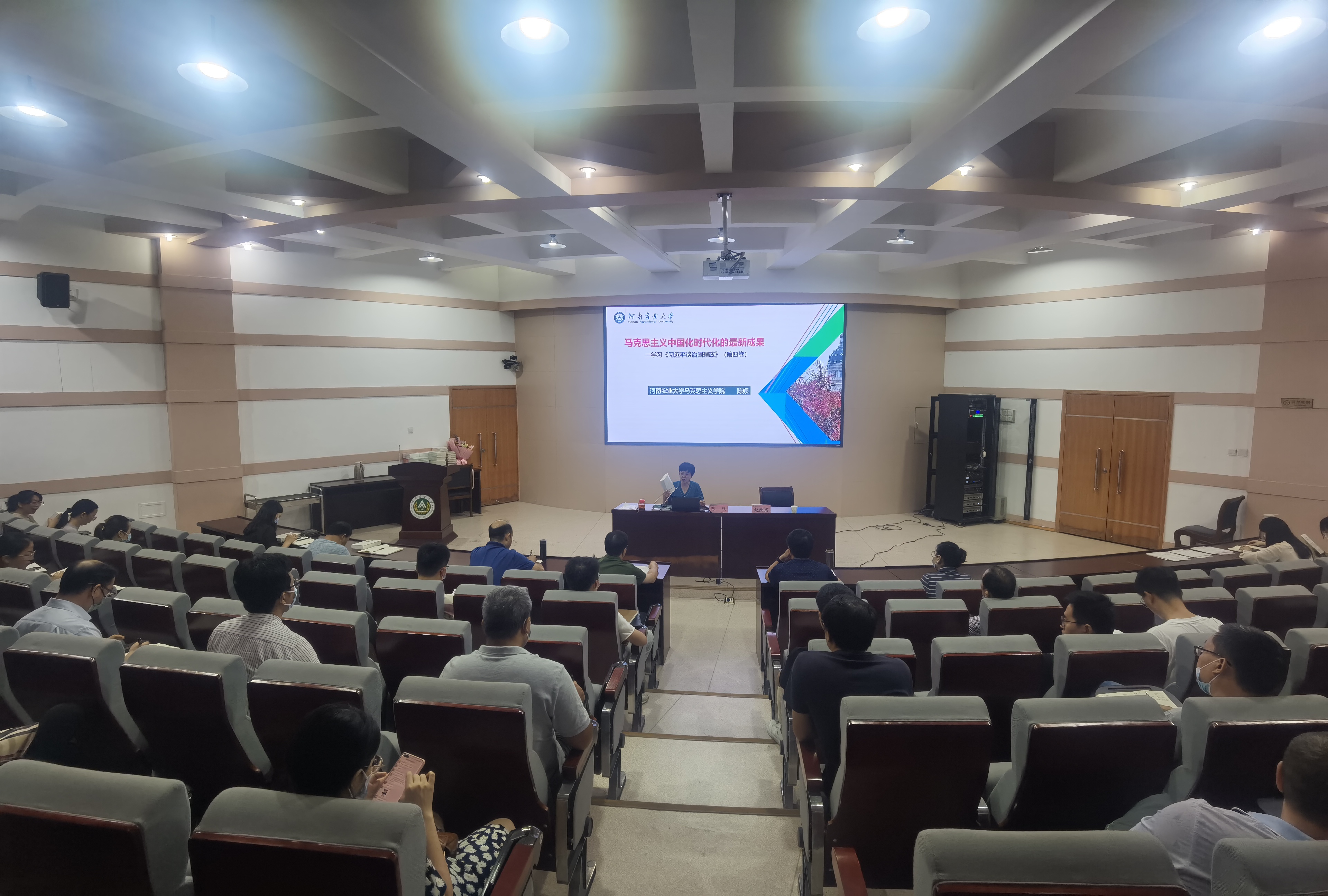 陈娱教授围绕《习近平谈治国理政》第四卷为全体教师作专题辅导。她指出《习近平谈治国理政》第四卷生动记录了以习近平同志为核心的党中央面对百年变局和世纪疫情相互叠加的复杂局面、团结带领全党全国人民应变局开新局的伟大实践,汇集了一系列原创性的治国理政新理念新思想新战略,科学回答了“中国之问、世界之问、人民之问、时代之问”,深刻阐发了中国之路、中国之治、中国之理,集中展示了马克思主义中国化时代化的最新成果,为我们开启了“思想之窗”,指明了“致胜之道”,开辟了“复兴之路”,集中展现了马克思主义中国化时代化的最新成果,全面系统地反映了习近平新时代中国特色社会主义思想的新飞跃、新境界,为我们推动发展提供了科学指南、赋予了强大能量,我们应深学而笃行之。最后陈教授表示大家要把拥护“两个确立”、做到“两个维护”体现在岗位上、落实到行动中,不断提高政治判断力、政治领悟力、政治执行力,集中精力做好当前工作,以实际行动迎接党的二十大胜利召开。