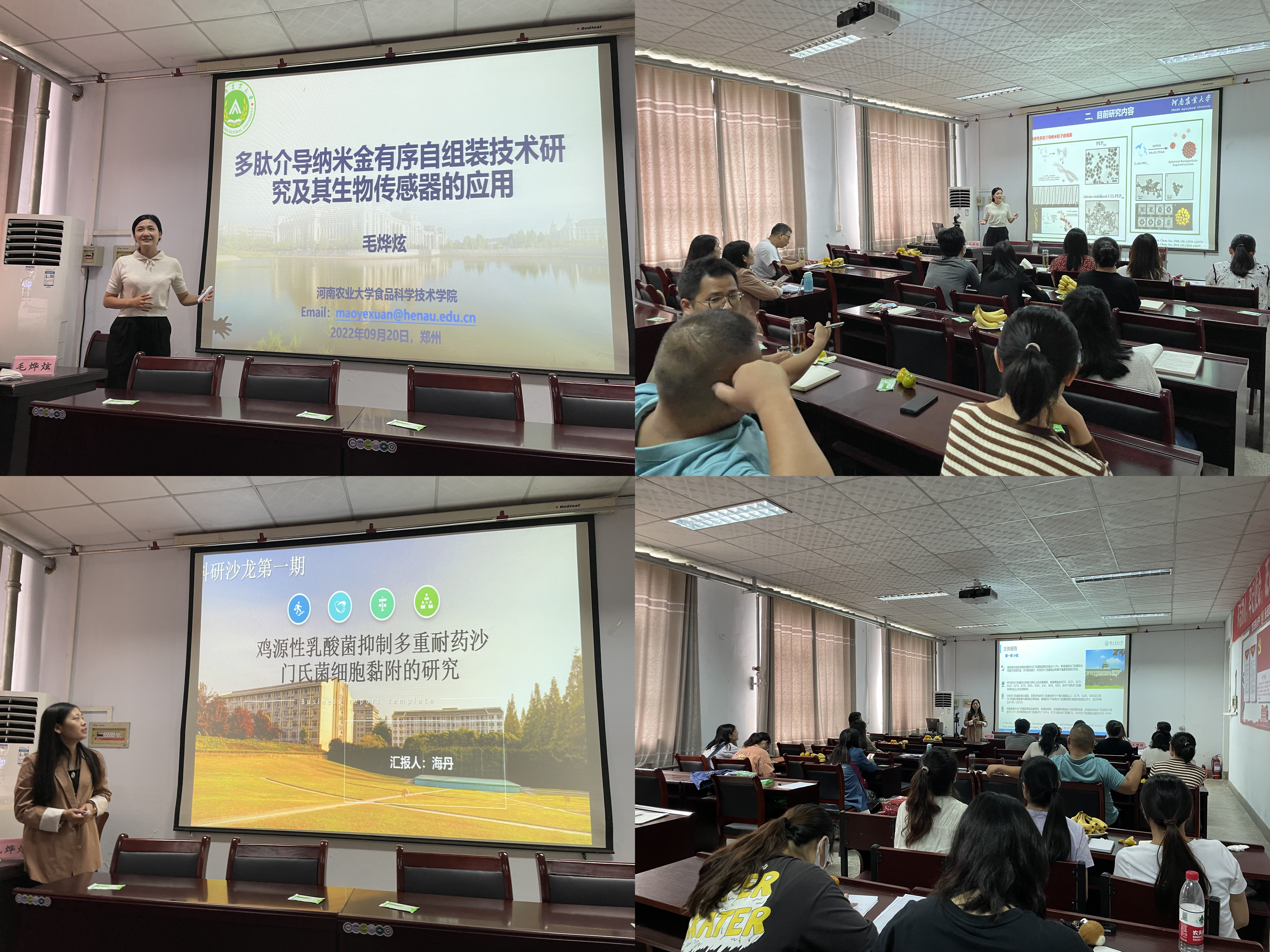 本次学术交流由毛烨炫博士和海丹博士进行主题报告。毛烨炫博士的报告主题围绕“多肽介导纳米金有序自组装技术研究及其生物传感器的应用”展开,介绍了如何运用微量热泳动技术建立研究蛋白聚集行为,如何设计新型多肽类抑制剂来探究蛋白聚集的因素,以及两亲性多肽介导纳米粒子自组装、β-脂环素的检测等等。海丹博士的报告主题围绕“食品中沙门氏菌的生存及防控研究进展”展开,介绍了鸡源性乳酸菌的筛选、乳酸菌黏附能力的测定、乳酸表层蛋白对乳酸菌黏附作用的影响、利用高通量测序技术研究乳酸菌在体内拮抗沙门氏菌的效果及机制研究,以及乳酸菌发酵剂的制备工艺及应用等。