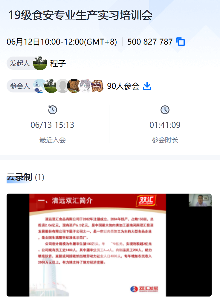 (通讯员 程永霞)为加大同学们对食品企业安全生产管理的认识,更好地完成生产实习。2022年6月12日食品质量安全系邀请清远双汇食品有限公司办公室主任王龙对同学们进行食品企业安全生产培训。培训采用腾讯会议(500-827-787)的形式进行,食安系教师程永霞、胡梅、党梦和全专业学生出席。会议由程永霞老师主持。会议开始,程老师先对王龙主任进行了介绍。王主任,有着12年的食品企业从业经历,期间担任调度室副主任、办公室主任、工会副主席,长期从事食品生产车间管理、品质管理和员工安全生产培训等工作,有着丰富的食品安全生产管理经验。