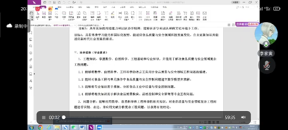教学秘书李家寅老师就工程认证做线上培训。全体食安系教师和承担食安专业课程的老师参加了此次培训。李老师首先分享了食品科学与工程专业教育部工程教育专业认证的经验心得。李老师指出,教育部工程教育专业认证主要对专业学生培养目标、质量、师资队伍、课程设置、实验设备、教学管理、各种教学文件及原始资料等方面进行评估。工程认证作为一个系统性工作,不管在硬件还是软件上,都需要集澳门银河App