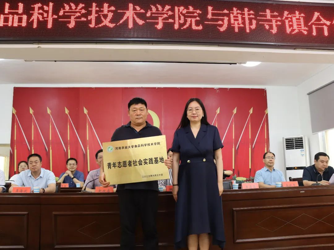 大学生社会实践基地揭牌仪式在中牟县韩寺镇人民政府举行,中牟县委副书记、韩寺镇党委书记魏玮、副县长吴海波、韩寺镇全体班子成员,院党委书记赵改名、院党委副书记李蓓蓓及澳门银河App
