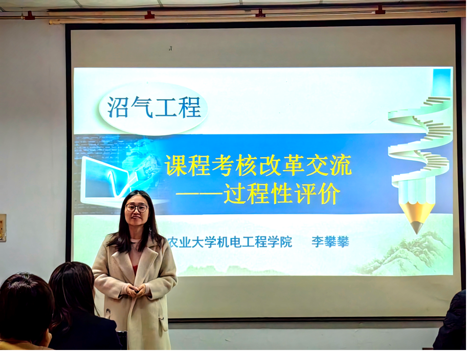 李攀攀老师以“以沼气工程为例的课程考核过程性评价改革”为题,从课程考核改革必要性、课程考核改革创新型、过程性评价的实施、课程考核结果分析、课程考核改革反思等五个方面向大家分享了课程考核改革经验和对于课程考核改革的思考。李攀攀老师丰富的教学经验为新进教师们提供了宝贵的指导和支持,新进教师们也将通过不断学习提升自己的教育教学水平。