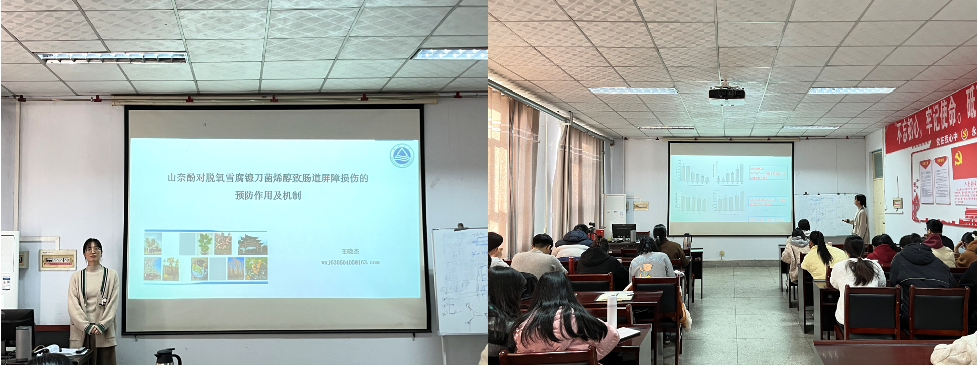 王晓杰博士首先就其博士期间研究领域深入讲解了山奈酚对脱氧雪腐镰刀菌烯醇致肠道屏障损伤的预防作用及机制,为在场研究生提供了良好的科研思路与指导。