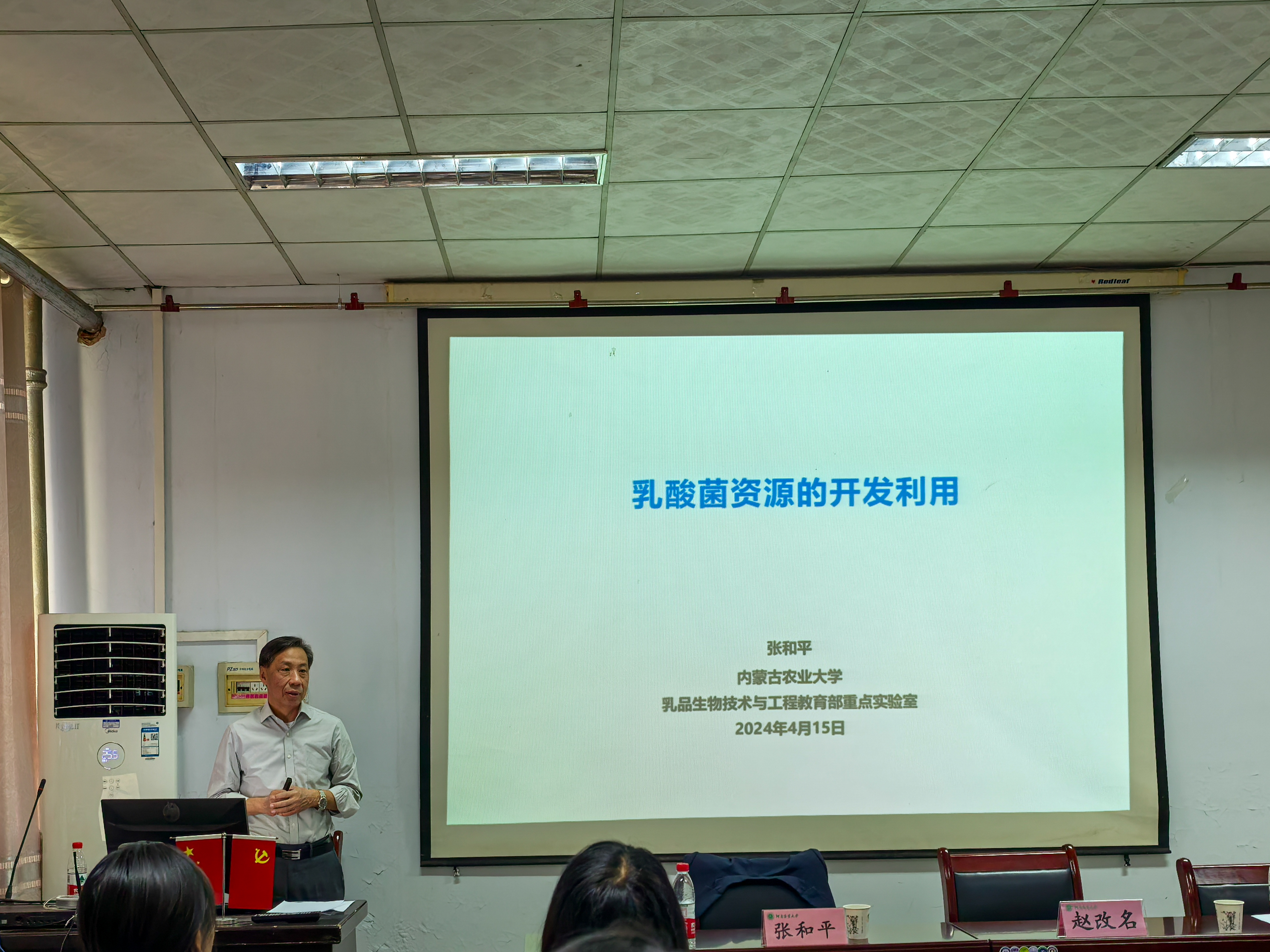 的师资力量、办学特色、相关实验团队和研究平台,随后做了题为“乳酸菌资源的开发利用”的报告并分享了自己工作30余年专注从事乳酸菌相关研究的切身体会,提出了基于人工智能筛选发酵剂的发展思路。随后,张教授一一回答了教师和学生的提问,并指出国内科研发展要致力于实现科技自强,打破“国外产品就是好”的固化思维,突破国外科技壁垒,展现出强大的自主创新能力和科技实力。