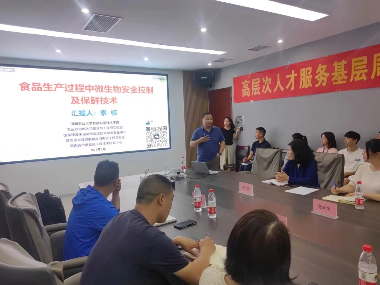 活动期间,索标教授主要负责对接金丝猴食品股份有限公司,该公司前身是创立于1992年的中国糖巧休闲食品企业。金丝猴食品倡导“甜蜜文化”,致力于为消费者提供高品质、创新的休闲食品。旗下主要有糖果系列、巧克力系列、烘焙系列、卤制品系列、喜铺系列等5大系列,200多个产品。公司拥有2大生产基地,年生产能力20亿元。服务全国1500多家经销商,覆盖近160000家零售网点。索标教授与沈丘金丝猴食品有限公司董事长李旸、研发及质检部门的负责人进行广泛深入的交流,就产品微生物安全控制、焙烤谷物食品开发等内容开展了讲座培训和座谈交流,并就联合科技攻关,微生物安全控制、产品研发、人才培养以及毕业生就业等初步达成了合作意向。
