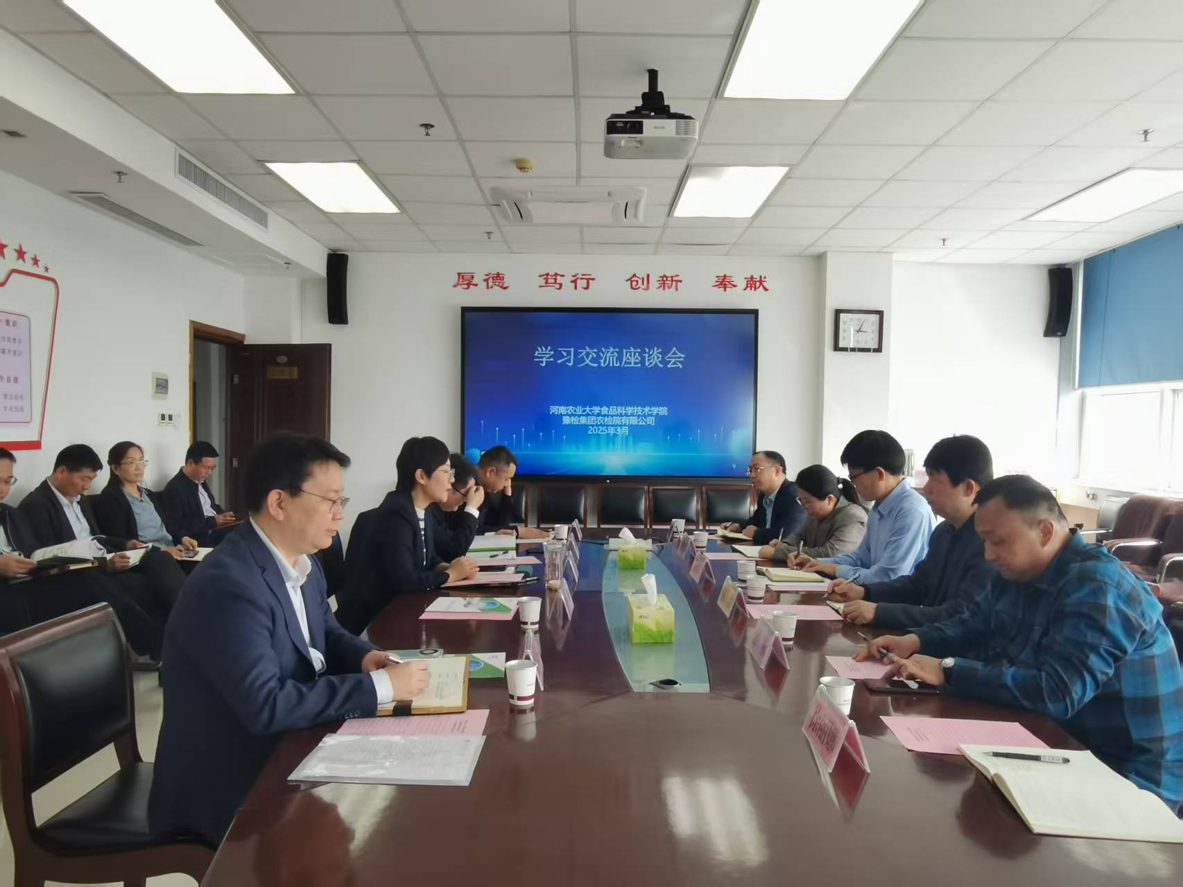 院长黄现青、副院长张剑、食工系主任柳艳霞、食安系主任索标、营养系主任高晓平、院办主任徐丽娜一行六人赴豫检集团农检院有限公司开展专题调研。