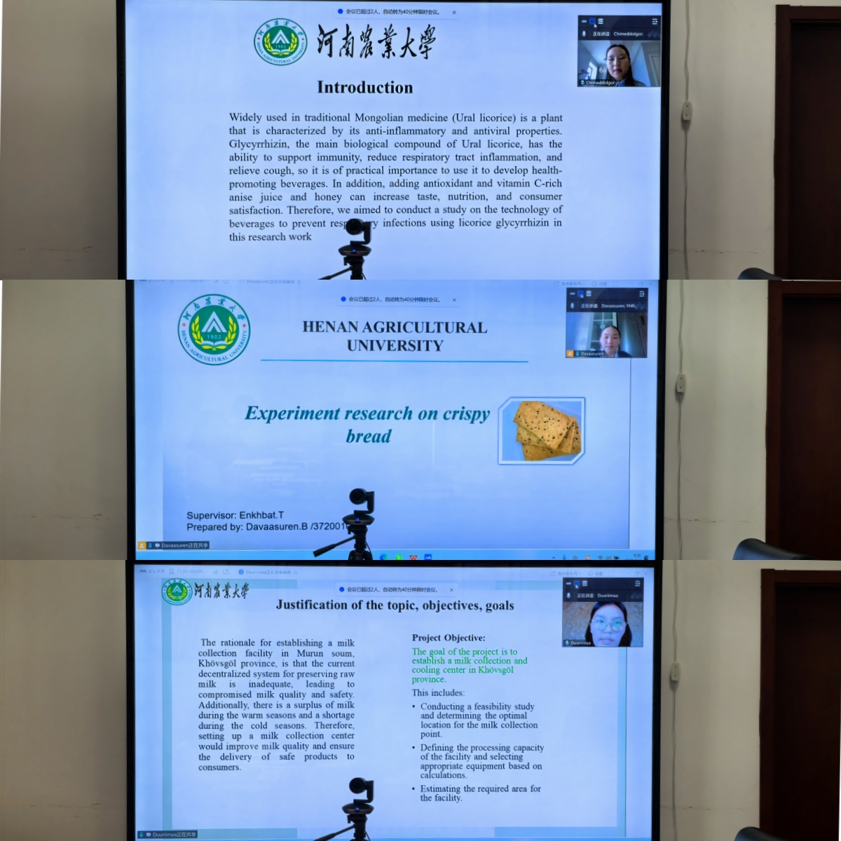 随后,三位留学生依次就各自的毕业论文课题进行了汇报。课题涵盖食品科学技术领域的多个研究方向,内容涉及食品营养、食品加工等方面。答辩评审专家们认真听取了汇报,并针对论文中出现的问题进行了详细提问,提出了宝贵的修改意见与建议。