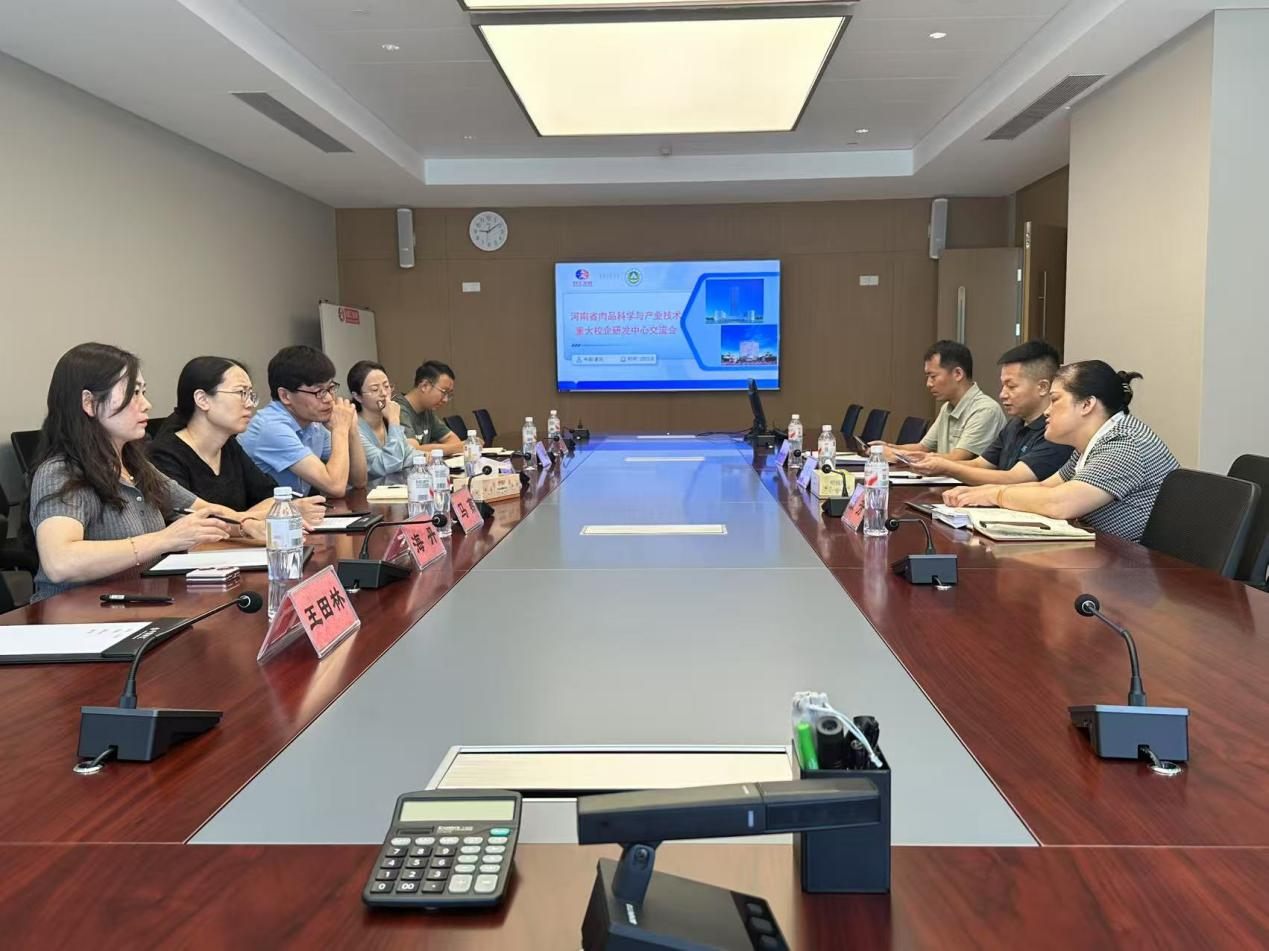 院长黄现青教授、马燕副教授、海丹副教授、王田林博士、白歌博士、张雨博士赴河南双汇投资发展股份有限公司,就共建“河南省肉品科学与产业技术重大校企研发中心”开展深度交流,双汇研发中心赵建生主任等出席会议。