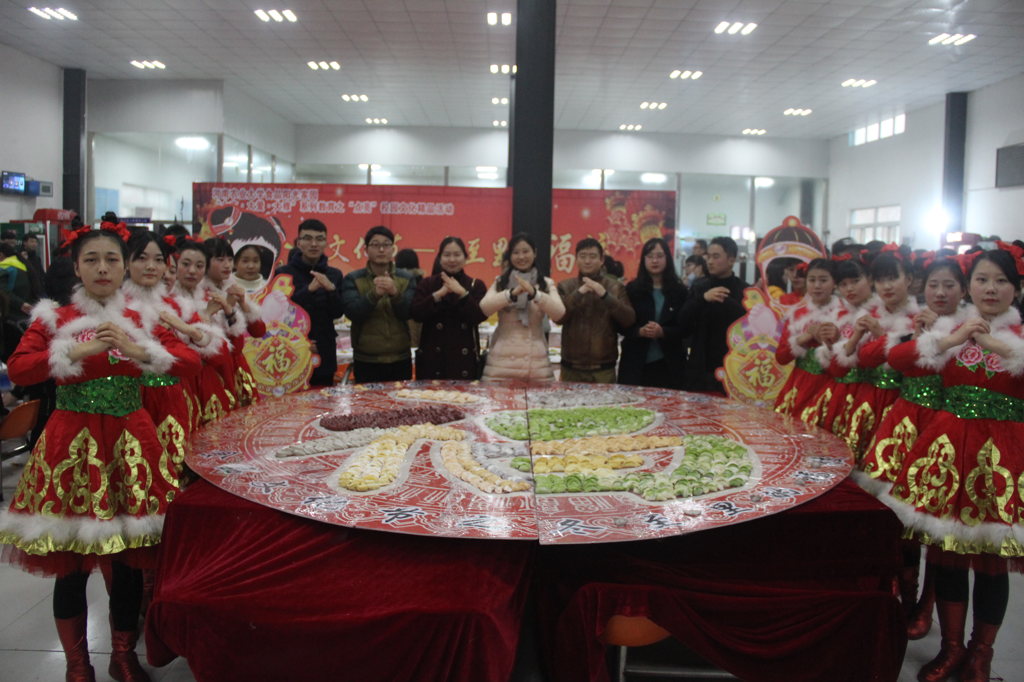 金鸡纳福,百福迎春。喜庆欢乐的歌唱,活力十足的舞蹈,幽默的小品“手机综合症”等开场节目精彩纷呈,现场氛围不断被推向高潮。接着进入到特别节目“冬至里的福饺”,澳门银河App 及澳门银河App 老师、学生“亲自下厨”,用橄榄菜汁、菠菜汁、胡萝卜汁等和面、集各地不同风俗习惯制作馅料,色彩缤纷的“彩饺”让人垂涎三尺。10名“福娃”将“福饺”摆于直径3米、7平方余的团型百福图上,取“纳百福”之意。此外,澳门银河App 阳光志愿者协会代表将“福饺”和“福”字窗花送给环卫工人、建筑工人、社区老人、离退休教师等,向他们表示慰问和祝福,祝愿“国利民福”。