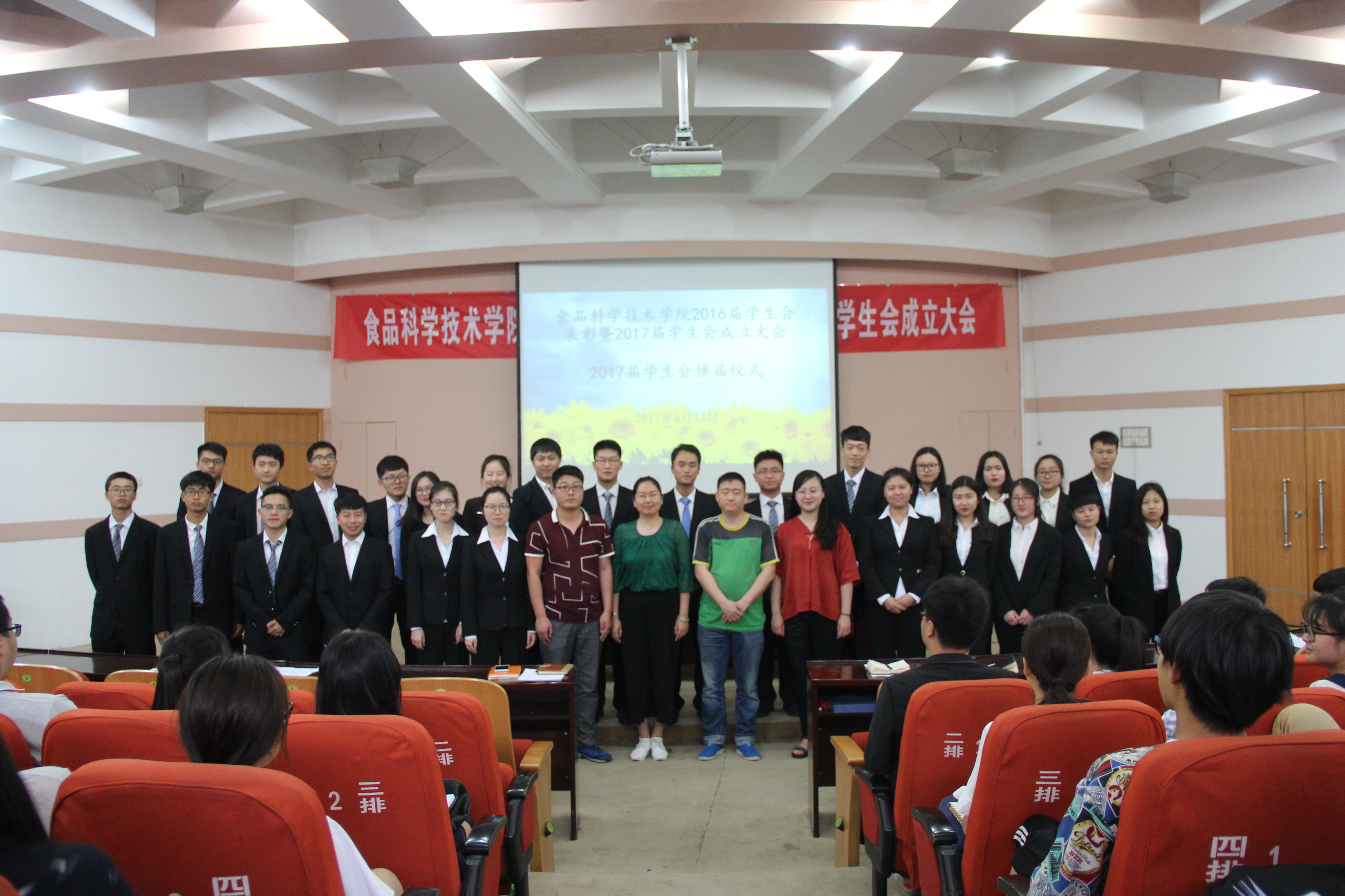 大会第一项,全体起立,奏国歌。随后,2016届团委委员王毓和学生会主席李嘉辉进行工作报告。接着,杨光宣读《关于表彰澳门银河App 2016届学生会工作突出贡献的集体及个人的决定》,张世昌宣布《关于澳门银河App 2017届团委学生会干部任用的通知》,2016届团委、学生会与2017届学生干部进行工作交接。而后,2017届学生干部代表周云飞、于智威上台发言,表明了自己的工作设想与开拓进取的决心。最后,李蓓蓓总结讲话,对2016届学生干部所作出的努力和贡献表示感谢,同时也希望新一届团委、学生会成员能够本着“一去三强”的工作理念,再创食品澳门银河App 的新辉煌。