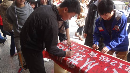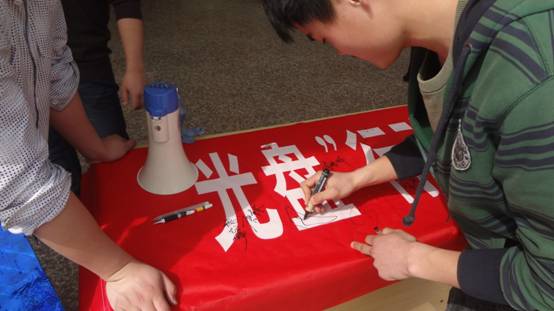 活动进行的途中,还有很多同学不知道 “光盘”的来历,小红帽们耐心的向大家讲解 “光盘”的由来。此次活动时间虽短,效果却非常的好,本来以为足够长的条幅,却发现最后来签字的人都没有下笔之处。