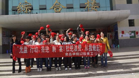 同学们头戴小红帽,兵分两路,一部分进入食堂,向正在吃饭的学生介绍此次活动,提倡他们吃光盘子里的食物;另一部分留在食堂门口,向进出食堂的人群宣传此次活动。