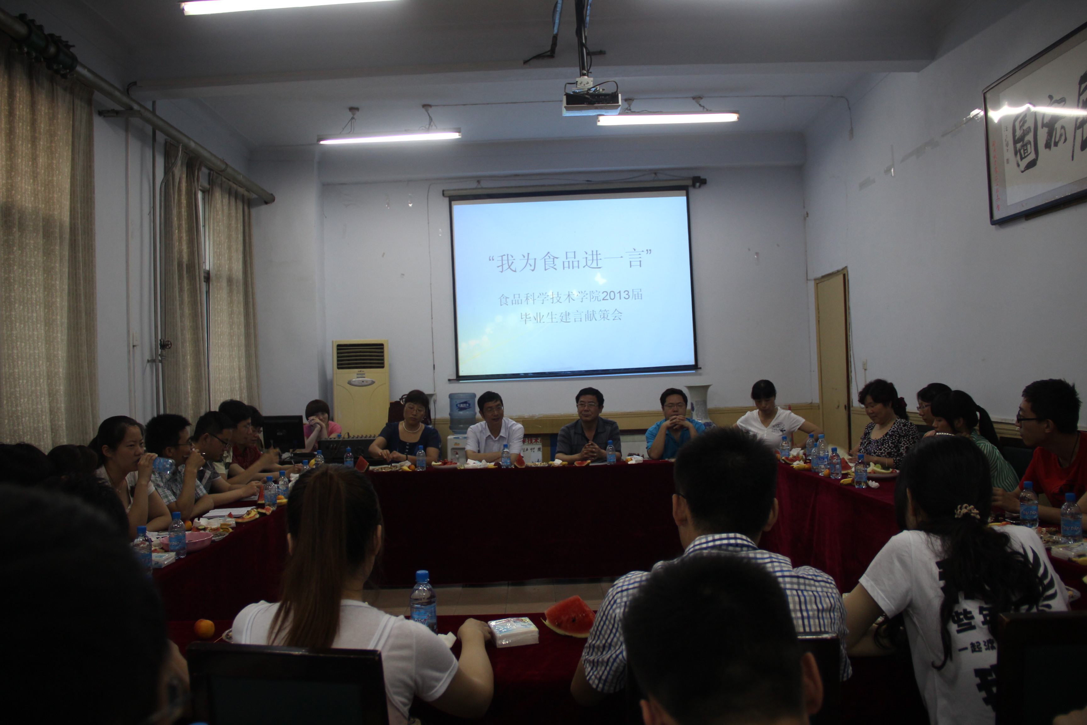 65上午,澳门银河App 在澳门银河App 一号楼报告厅举行“拳拳学子心,依依食品情”澳门银河App 2013届毕业生建言献策会。澳门银河App 党政主要负责人出席会议。澳门银河App 部分优秀毕业生代表参加了座谈会。