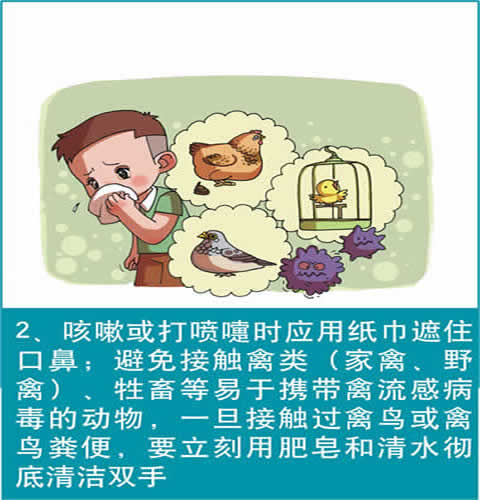 2.咳嗽或打喷嚏时应用纸巾遮住口鼻;避免接触禽类(家禽、野禽)、牲畜等易于携带禽流感病毒的动物,一旦接触过禽鸟或禽鸟粪便,要立刻用肥皂和清水彻底清洁双手。