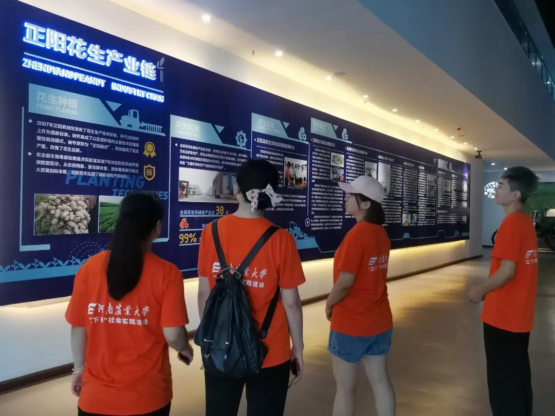 实践团队到正阳县新地花生集团开展企业调研,了解企业发展情况,学习了有关花生培养的相关知识,企业生产工艺流程和企业的校企合作项目发展情况。随后,来到花生展览展示中心及检测平台,一同参观了企业产品、生产车间、花生实验田,对相关检测手段技巧和检测技术设备的更新升级历程有了深刻认识。