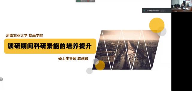 赵老师讲到读研期间科研素能的培养提升,先提出了两个问题“你认为科研素能包括哪些?”“你对自己读研期间科研素能提升的规划?”,并提出可以在科研创新能力、科学普及能力、科研成果产出能力、科研成果转化能力这四个方面提升科研素能。她指出,科技创新能力的提升需要扎实的知识储备,需要进行很多次的科研实践,可以参加科普宣讲比赛,增长自己的见识。科学普及能力的提升可以自己写科普文章以及制作科普视频,以此锻炼自己。科研成果产出能力的提升,可以通过发表期刊论文、申请专利、申报项目等方式获得。也可以通过在企业或者高校来实现,在企业车间实习锻炼自己,善于发现问题,将自己的学习成果运用到实际问题上,实现科研成果的转化。