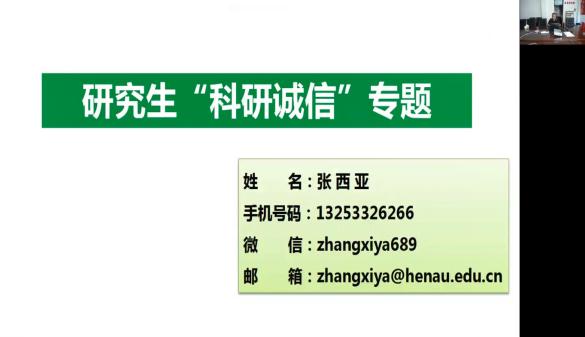 研究生学风建设,优化学术诚信环境、教育和引导广大研究生形成求真务实、诚信严谨的学术风气,培养研究生积极探索、勇于创新的学术精神,张西亚老师为21级研究生开展了“科研诚信”的专题讲座。