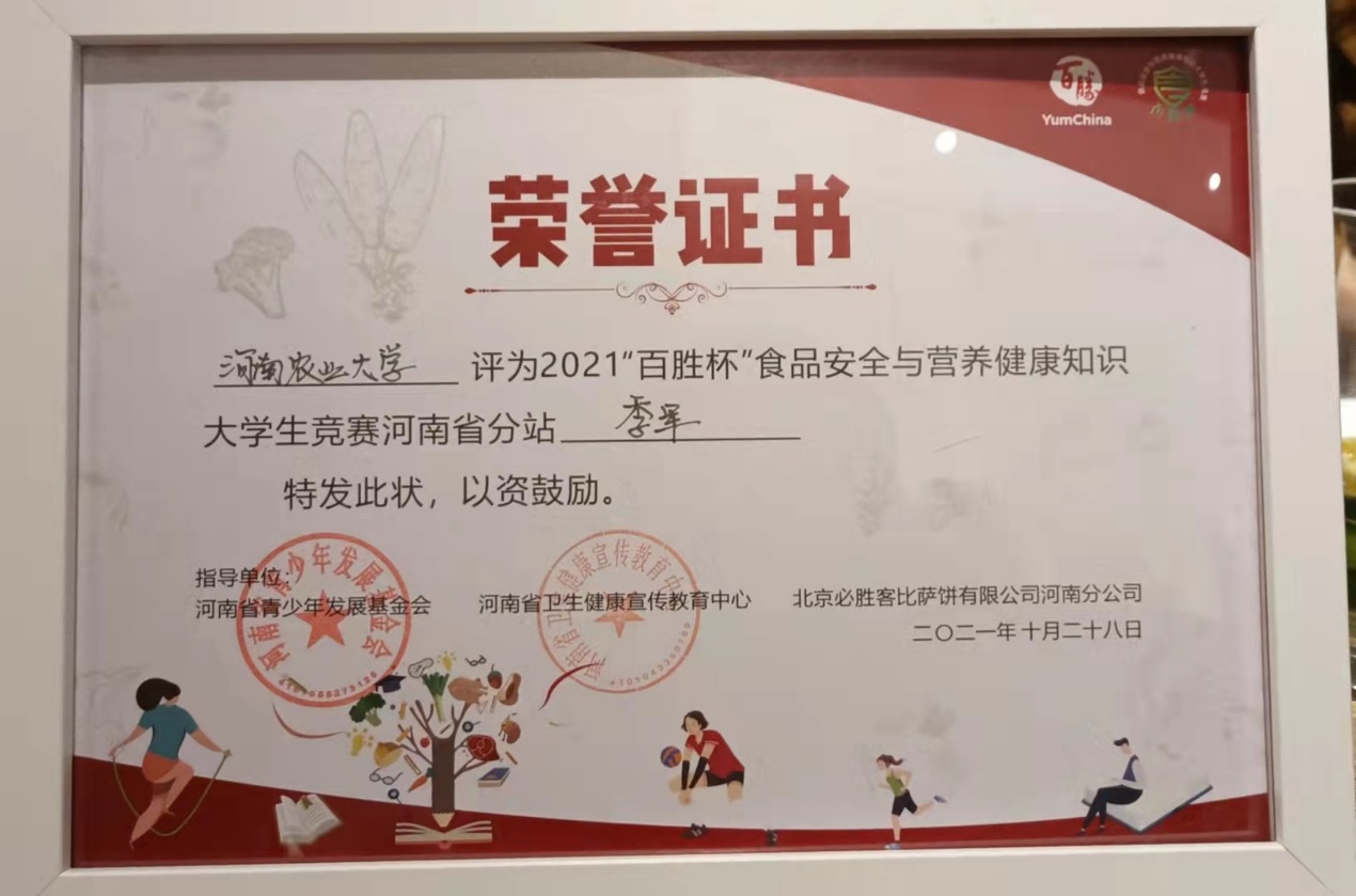 (通讯员 乔可欣 图片 王曼莉)为进一步提升大学生食品营养与健康知识综合素质,倡导大学生健康生活方式,由共青团河南省委、河南省卫生与健康宣教中心、郑州市市场监管局指导,2021年全国“百胜杯”食品安全与营养健康知识大学生竞赛河南省分站赛,今日在郑州市高新区必胜客万科餐厅举行。由澳门银河App