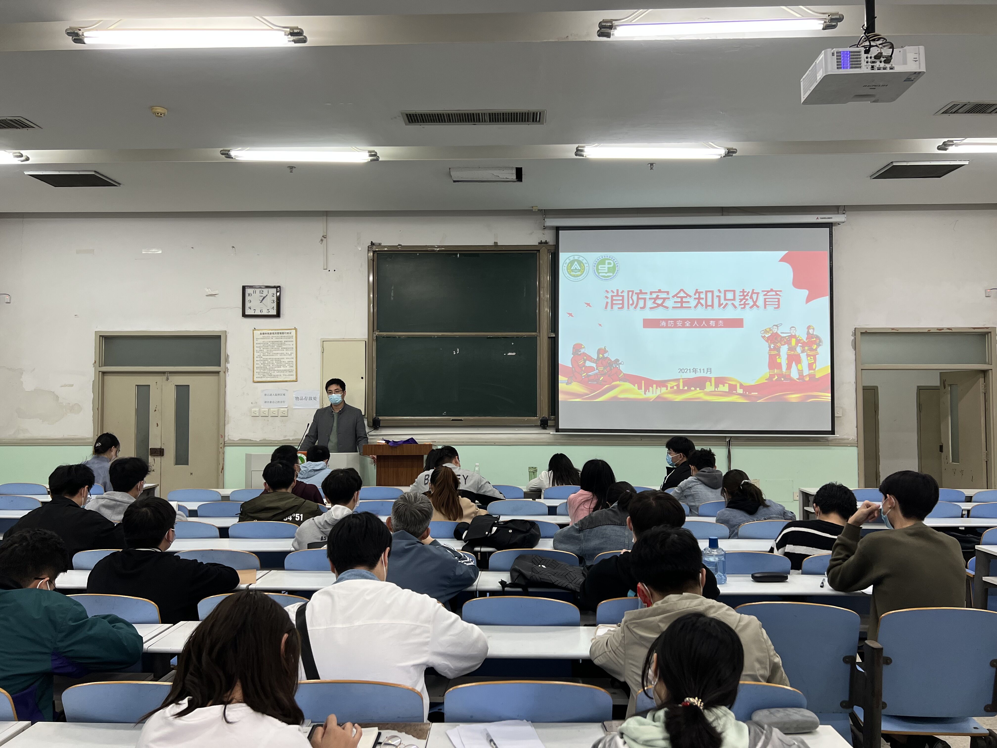 张金龙向同学们详细地讲解了如何树立公共消防意识、预防和杜绝可能引起消防事故的内外隐患等方面的知识和技能。他提出“生命至上,安全第一”的思想,并通过大量真实案例与理论相结合的方式,为大家讲解了一些防火技巧和应对措施。同时,他结合校园生活实例讲解了宿舍防火、用电等注意事项,强调了宿舍大功率电器的使用和管理问题,纠正了日常生活中学生们对于防火的一些错误认识。他提出,在实验时要注意危险物品的使用,仔细阅读使用说明。并告诫同学们生命只有一次,同学们要时刻保持高度的安全警觉。