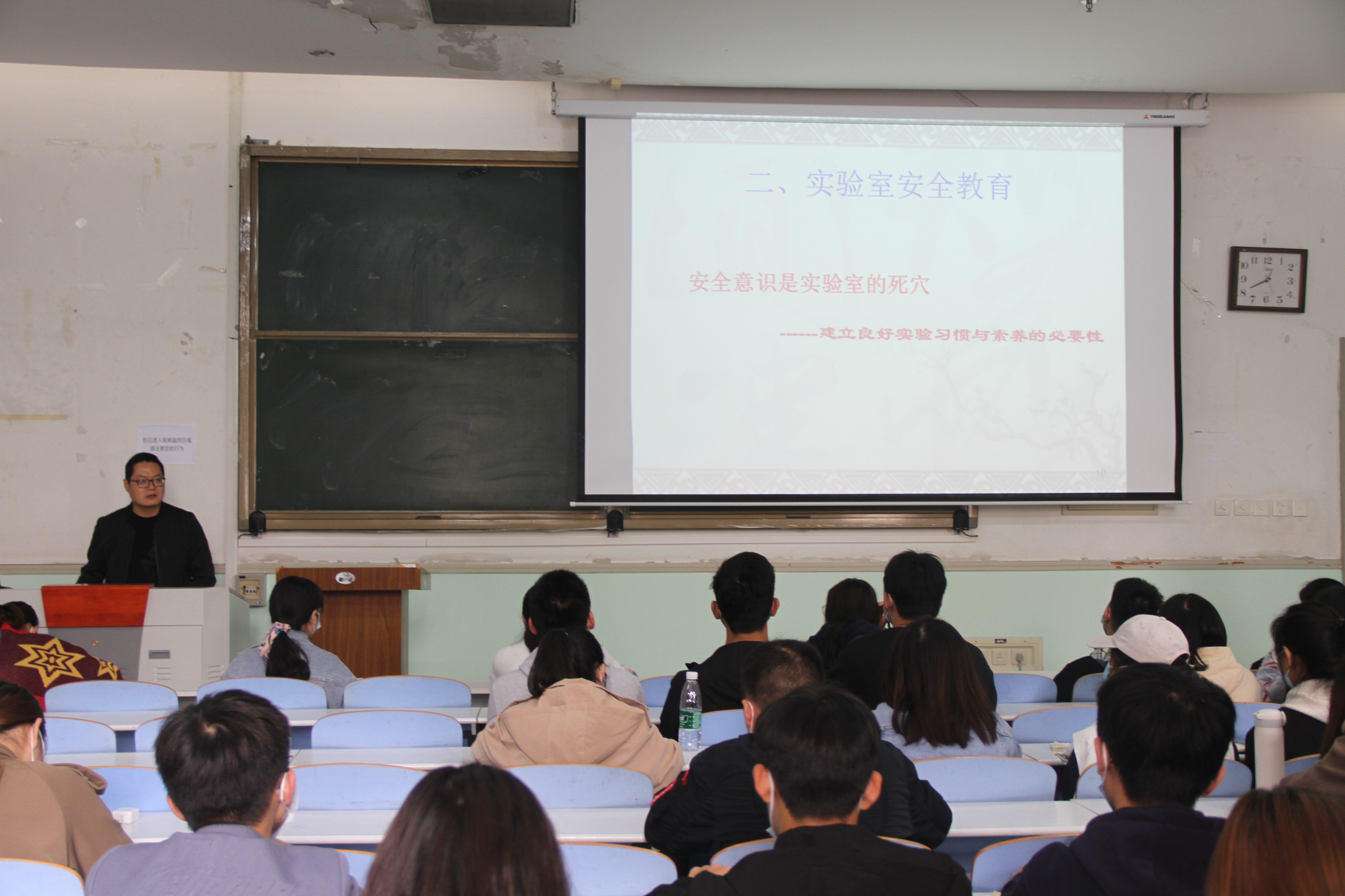 的真实实验室事故案例为切入点,向同学们强调了拥有安全意识的重要性,并提醒同学们严格按照操作规程进行作业,预防实验室安全事故的发生。同时,他以案例的形式,从水、电、火、化学四个方面讲解了实验室常见的安全问题,并提出了相应的解决措施,他指出,懒惰是实验室不良习惯的根源,希望同学们养成良好的习惯,确保个人和实验室的安全。