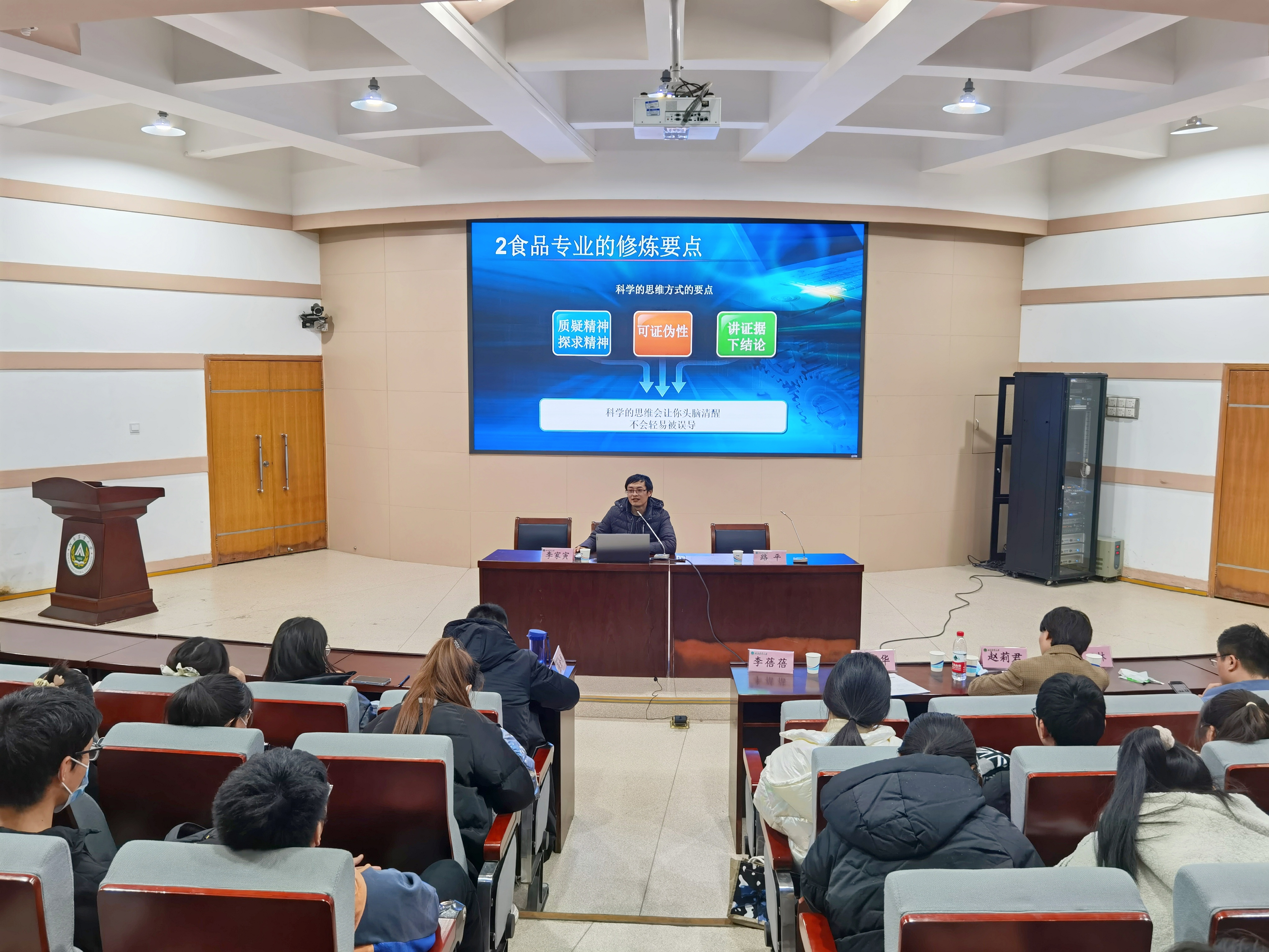食品专业修炼指南》为题从食品专业介绍、食品专业修炼要点、大学生活的一点感悟三方面进行了生动的讲解,使大家对以后的职业生涯规划有了清晰的认知。