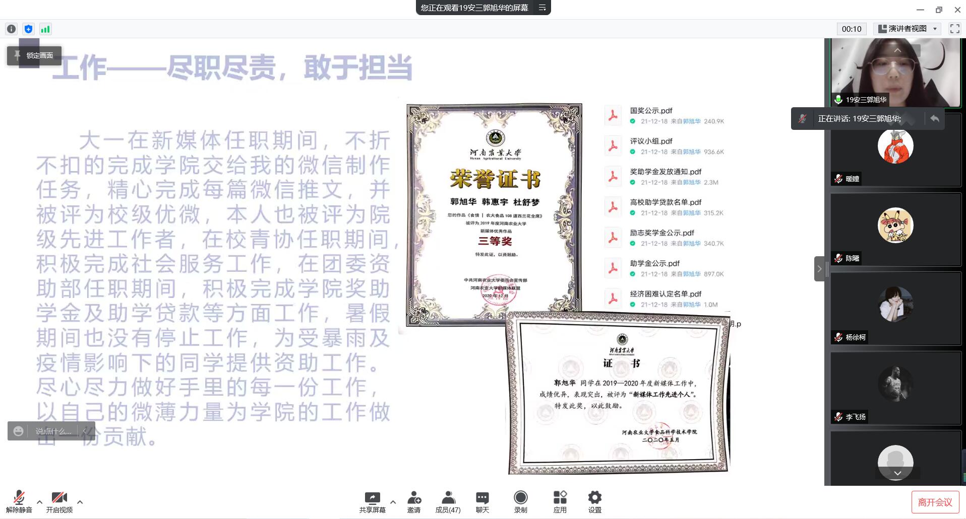 各位参选的个人与班级代表在有限的时间内,根据提前准备好的PPT对自身优势进行阐述。先进个人参选者们分别从学习、工作、荣誉、思想、社会实践等方面向大家分享了自己的经历。优异的成绩、卓著的荣誉、丰富的工作经验、向党靠拢的决心,无不表现出了他们独特的风采。班级代表们用班级的各项成就,以及班级同学们各项荣誉,为大家展现出了一个个井然有序,团结向上的集体。参选者与班级代表们面对演讲从容不迫、有条不紊,散发着自己的光芒,两个小时的会议,充分展现出了澳门银河App