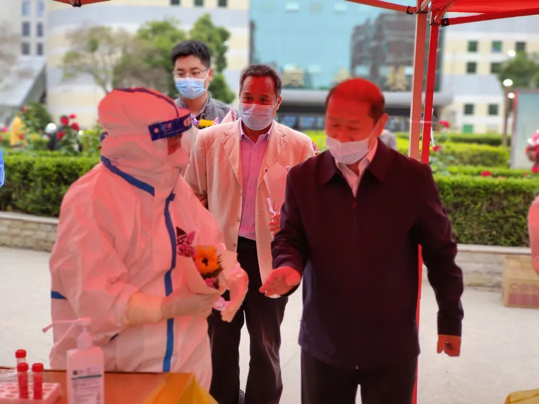 准备了鲜花献给现场辛勤付出的医护人员,并表达了对他们的祝福和感激。