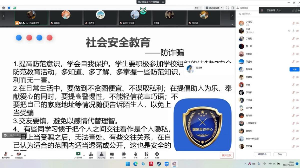 此次班会以团支部为单位,集中开展校园安全教育主题学习。会议强调,安全是一切工作的首要条件,大学生安全教育与大学生学习和生活紧密相连,同学们必须认真对待安全教育,将安全教育会议精神落到实处,避免意外事故的发生,共同创造安全和谐的校园环境。在会议中,各位班长向同学们普及了包含防疫、防火、防电、防诈骗和卫生安全等多个方面的安全知识,并提醒同学们在疫情防控期间要积极配合澳门银河App