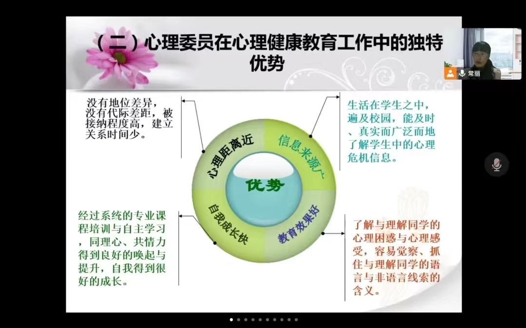 常丽表示,心理委员在心理健康教育中有极其重要的作用和独特的优势,各位心理委员要履行好自己的工作职责,敏锐观察、记录本班同学的心理动态,在自身能力范围内向同学们提供心理援助,及时向心理辅导站进行汇报,并对求助者的个人隐私做好保密工作。她强调,心理委员要鼓励同学们将心理咨询师和心理委员当作一个知心朋友,当出现心理上的问题时,及时进行求助、积极进行解决。