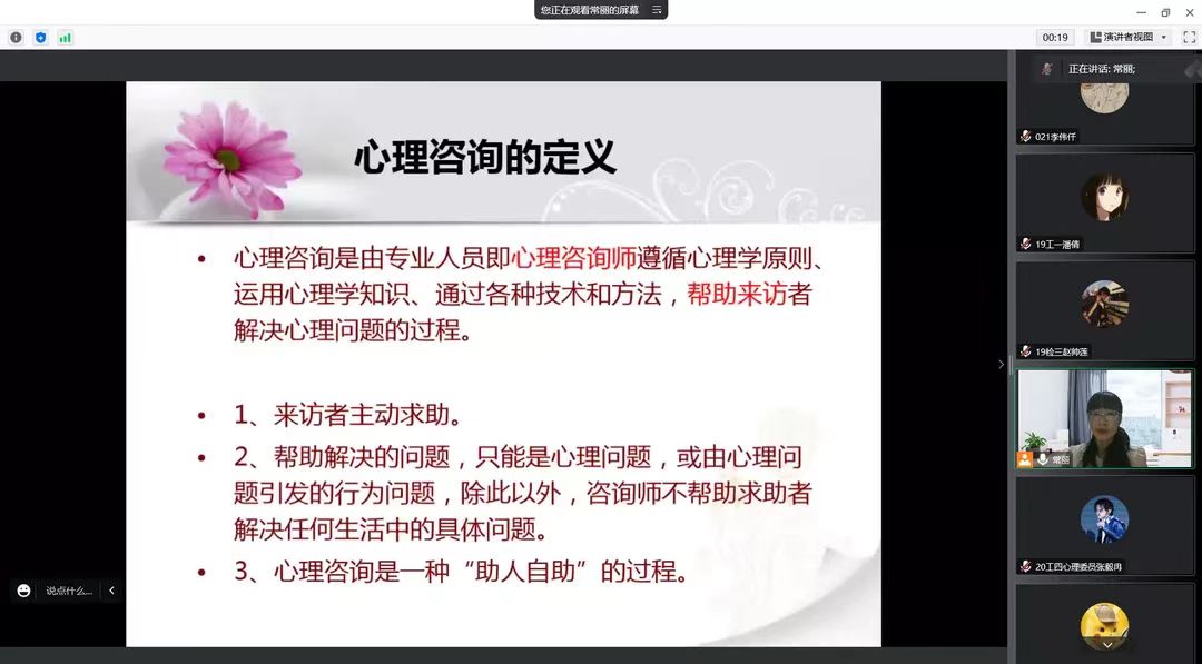 会议伊始,常丽为大家讲解了心理咨询的定义,并指出了几种学生容易对心理咨询产生的错误观点,以及心理健康的标准和不良状态的特点。她提出,心理咨询就像是照镜子,而心理咨询师就是一把拐杖,拐杖只能辅助行走,并不能替你决定人生的方向和旅途,最重要的是要从镜子中认清自己,找到积极的自我态度。