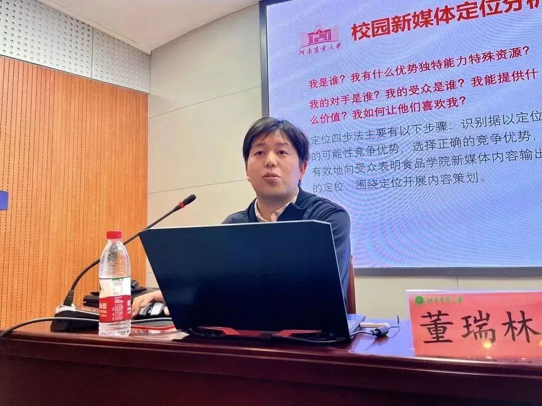 董瑞林以《校园新媒体工作经验分享——做一个有趣的校园新媒体人》为主题,结合目前媒体融合时代的形势,从校园新媒体定位、运营特点与方法论、做成熟媒体人、意外的收获四个方面向同学们分享了宣传经验和方法。他根据微信公众号、抖音、小红书和微博的特点详细剖析了不同媒体的运营策略,并引用国务院总理李强的讲话强调了调查研究的重要性。他表示,优秀的新媒体工作者应该具有文案策划能力、组织能力、担当精神和创新精神。最后,他真诚寄语同学们,要找准定位,发挥好校园新媒体的优势,链接社会资源,讲好青春故事。