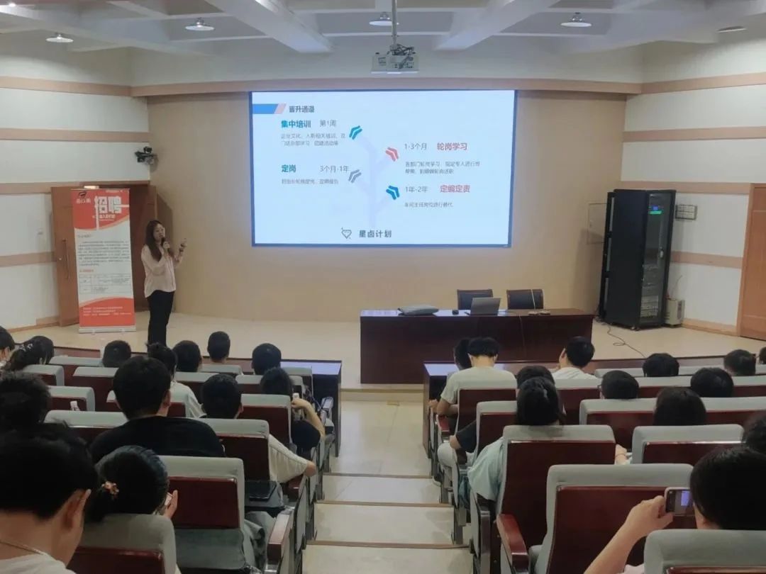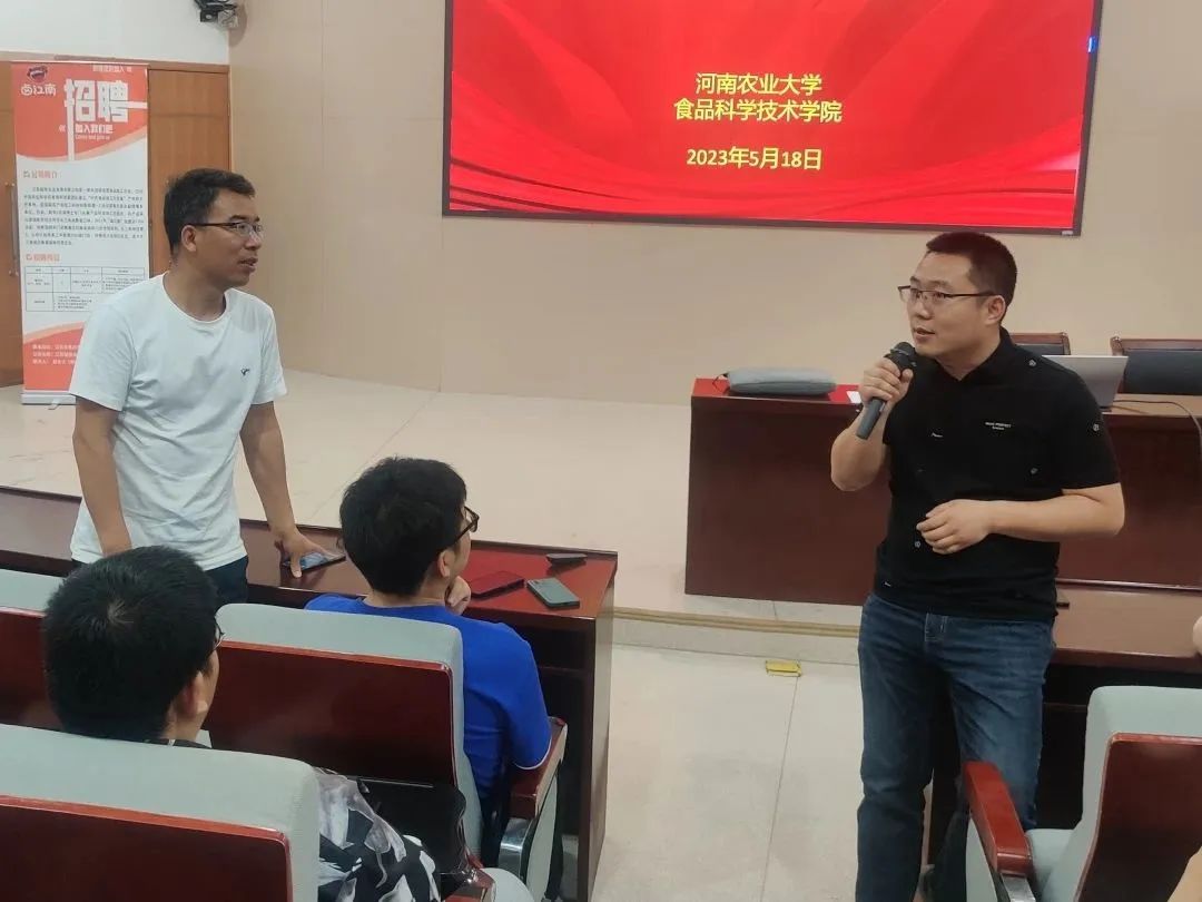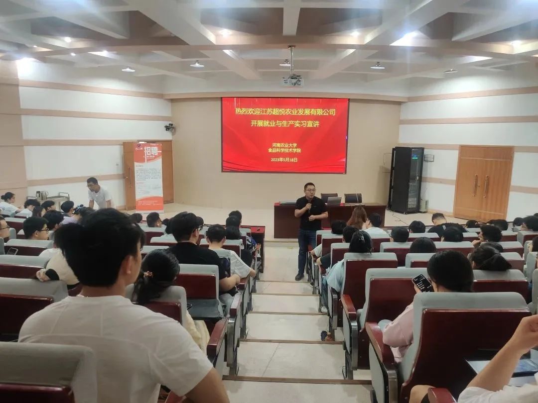 于文化路校区三百人报告厅召开江苏超悦农业发展有限公司招聘宣讲会暨生产实习培训会,院党委组织员陈翔、食工系副主任徐超、企业综合管理部负责人温彦涛、人事主管赵如琴、人事专员单胜飞出席会议,2020级部分学生参加。
