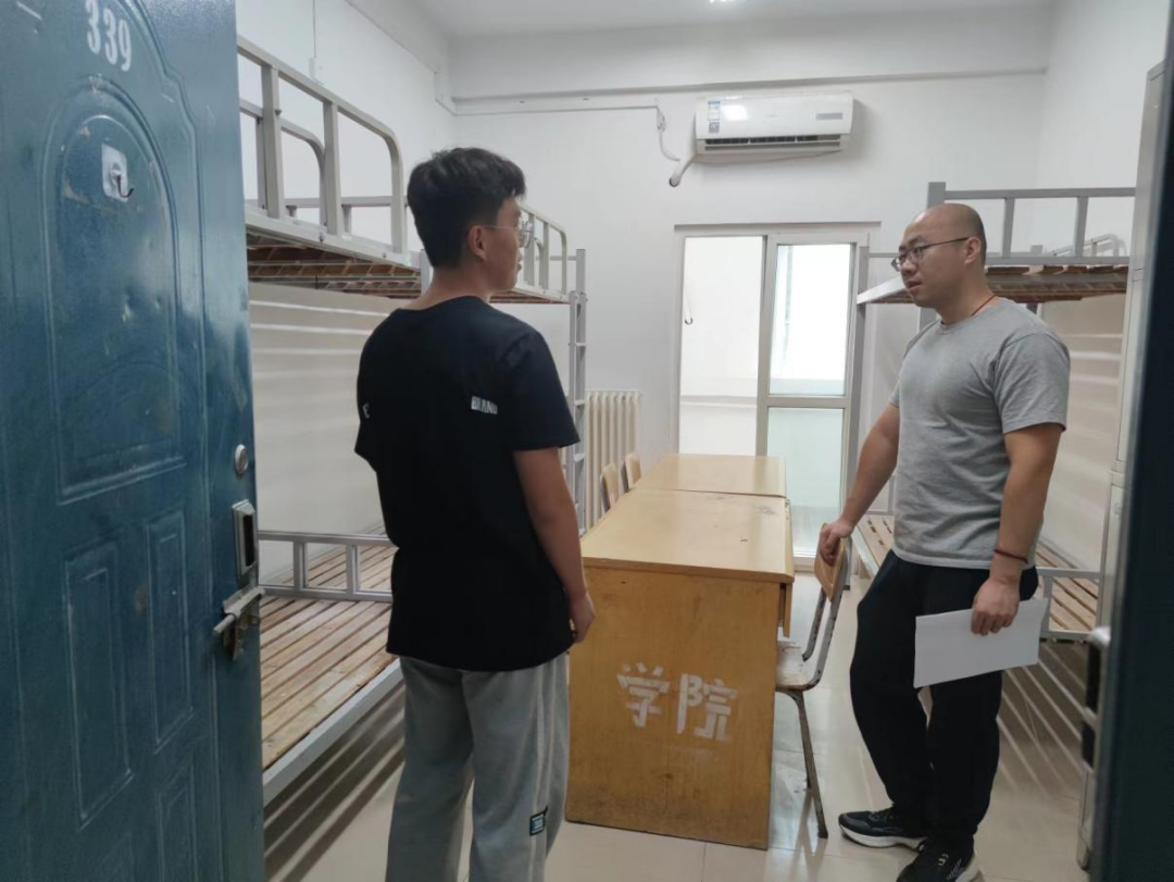 辅导员陈凯、补彤对新生宿舍进行检查,学生会生保部成员一同前往。
