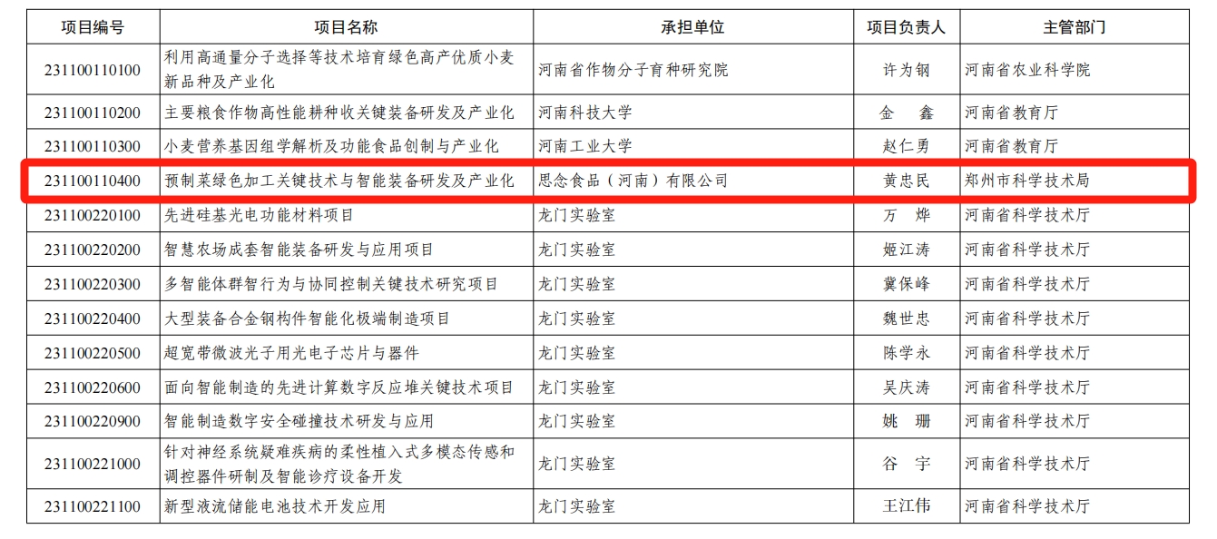 根据《河南省2023年第二批科技发展计划下达通知》(豫科[2023]135号),澳门银河App 二级教授、教授级高工黄忠民主持的河南省重大科技专项“预制菜绿色加工关键技术与智能装备研发及产业化”获批立项(项目编号:231100110400)。项目财政经费1000万元,研究期限3年,参加单位包括思念食品(河南)有限公司、千味央厨、九豫全等预制菜产业头部企业,以及郑州轻工业大学、北京工商大学、中原食品实验室等十余家科研单位。