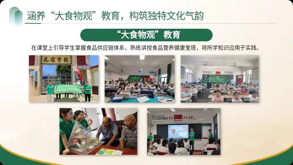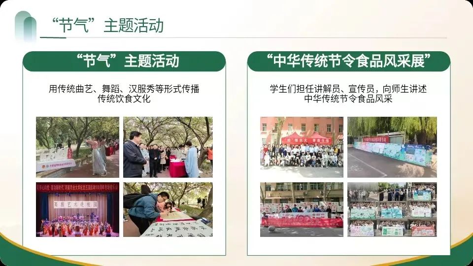 课程积极融入“大食物观”教育,在课堂上引导学生掌握食品供应链体系,熟练讲授食品营养健康宝塔,讲所学知识应用于实践。举办以“节气”为主题的饮食文化活动,用传统曲艺、舞蹈、汉服秀等形式传播传统饮食文化,举办“中华传统节令食品风采展”主题科普活动,学生们担任讲解员、宣传员,向师生讲述中华传统节令食品风采。将党的二十大报告提出的“树立大食物观”“构建多元化食物供给体系”不断落细、落小、落实。以多种形式构建浸润式“大食物观”文化育人模式形成“以文化人”实践教学模式。澳门银河App