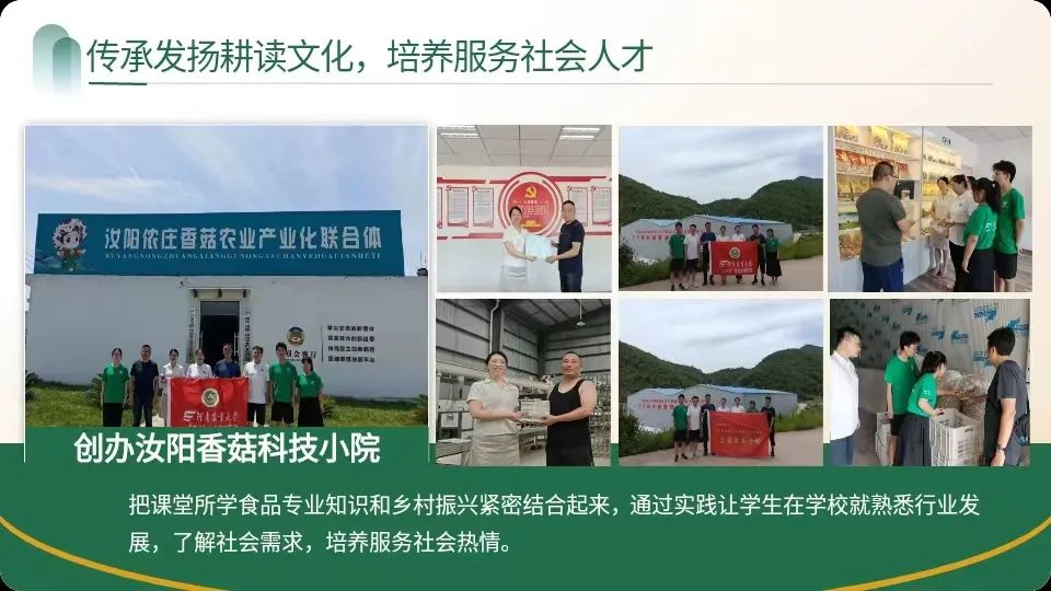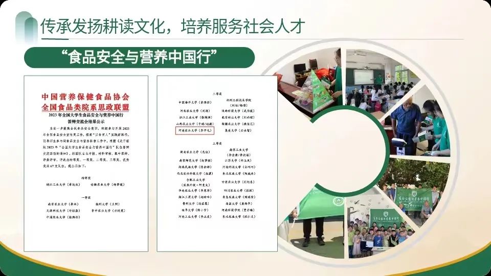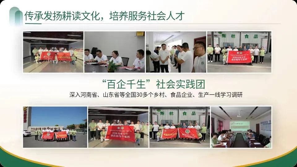 着力引导青年学生走入企业、走向社会,走进一线,用食品安全与营养科普知识服务社会、服务人民,上好“走在中国大地上”的实践大课堂。让学生在冒热气、粘土味的实践中,厚植爱农情怀,练就兴农本领。在全国大学生“食品安全与营养中国行”活动中荣获全国二等奖。“百企千生”社会实践团深入河南省、山东省等全国100多个乡村、食品企业、生产一线学习调研,创办汝阳香菇科技小院,把课堂所学食品专业知识和乡村振兴紧密结合起来,通过实践让学生在澳门银河App
