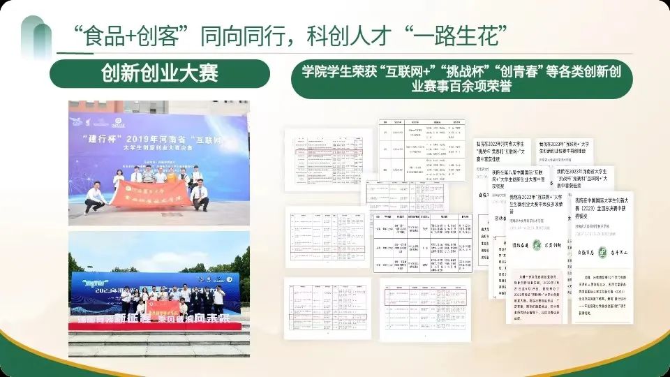 学生荣获“互联网+”“挑战杯”“创青春”等各类创新创业赛事百余项荣誉。培养出河南省大学生创新创业标兵樊鹏飞,李向阳、赵佳琪等创业典型,创业项目均实现营业额1000万以上。
